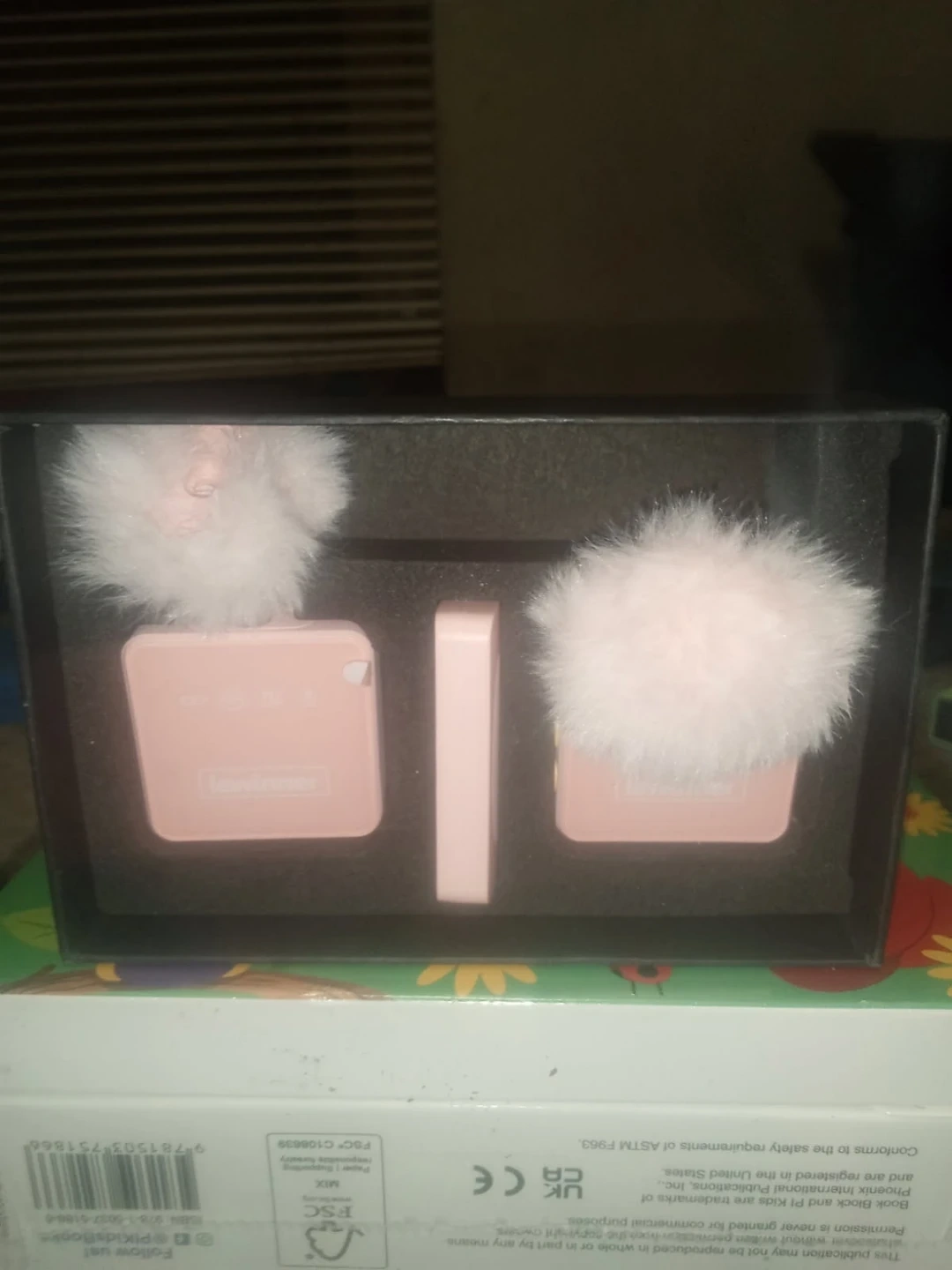 This set includes two wireless lavalier microphones and a receiver. They're designed for mobile phones and come with fluffy microphone covers. Pink color.