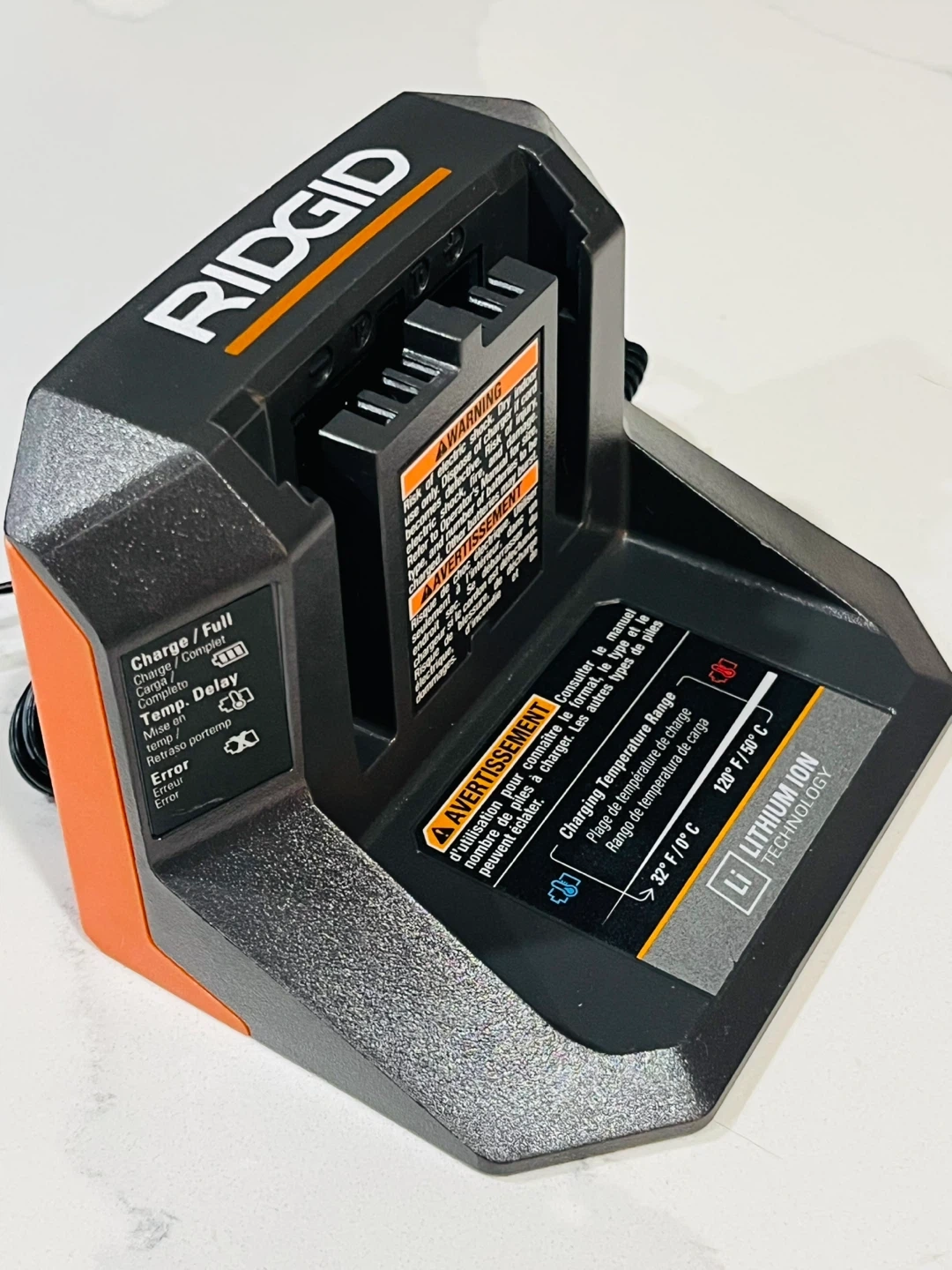 This is a RIDGID lithium ion battery charger. It has a charging temperature range of 32°F to 120°F (0°C to 50°C). It's compatible with RIDGID lithium ion batteries.