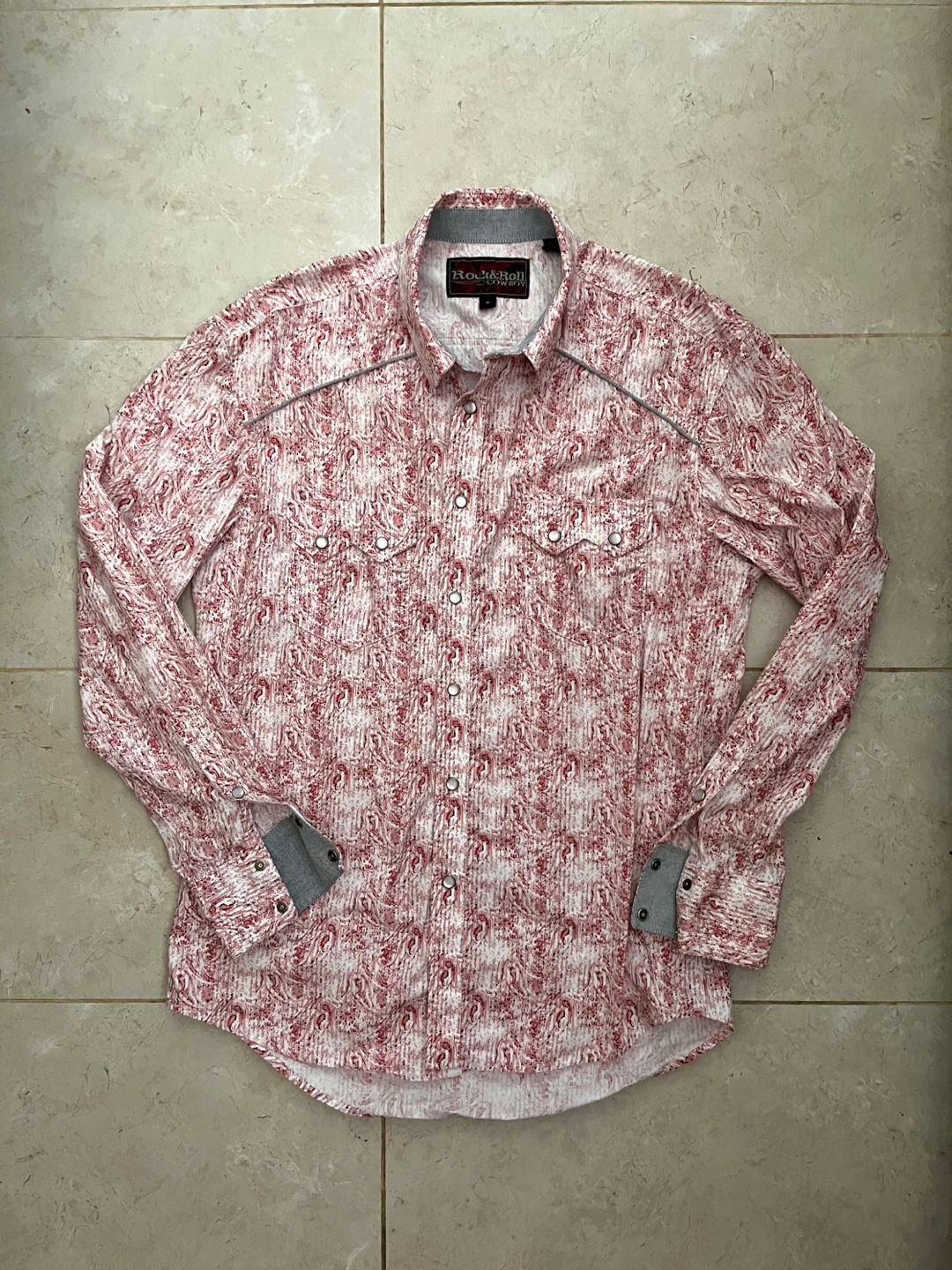 This is a Rock & Roll Cowboy from Alberta’s Lammle’s Western Wear button-up shirt. It features a striking red and white abstract pattern throughout. The shirt has classic western details like pearl snap buttons and pointed yokes.
