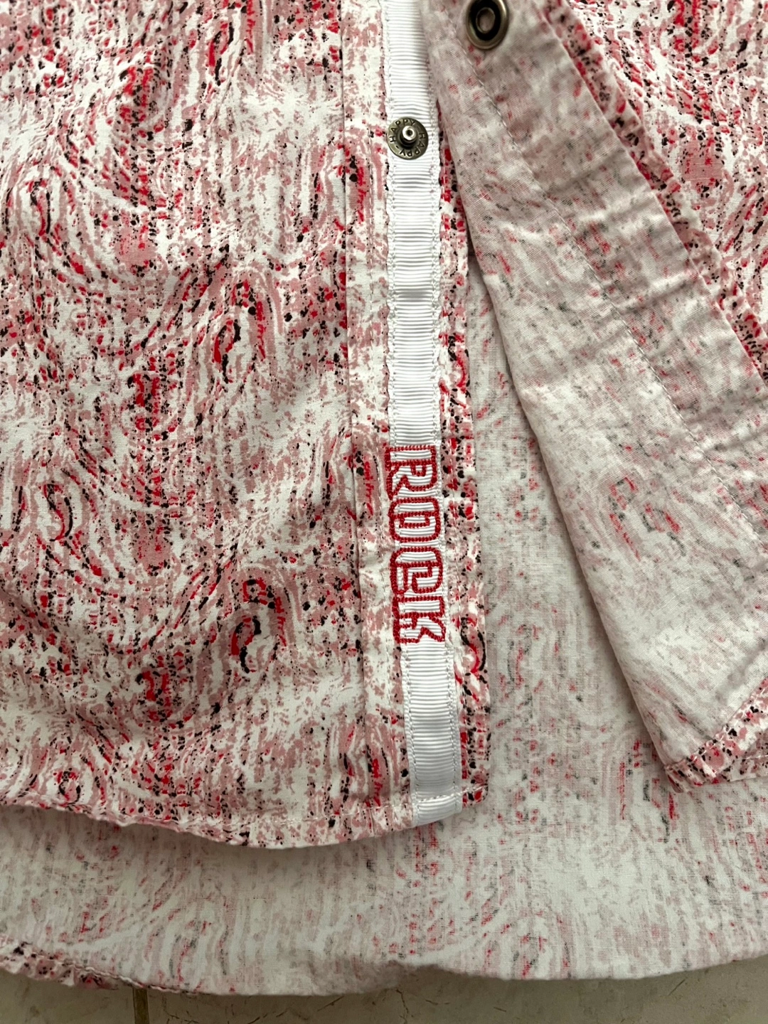 This is a Rock & Roll Cowboy from Alberta’s Lammle’s Western Wear button-up shirt. It features a striking red and white abstract pattern throughout. The shirt has classic western details like pearl snap buttons and pointed yokes.