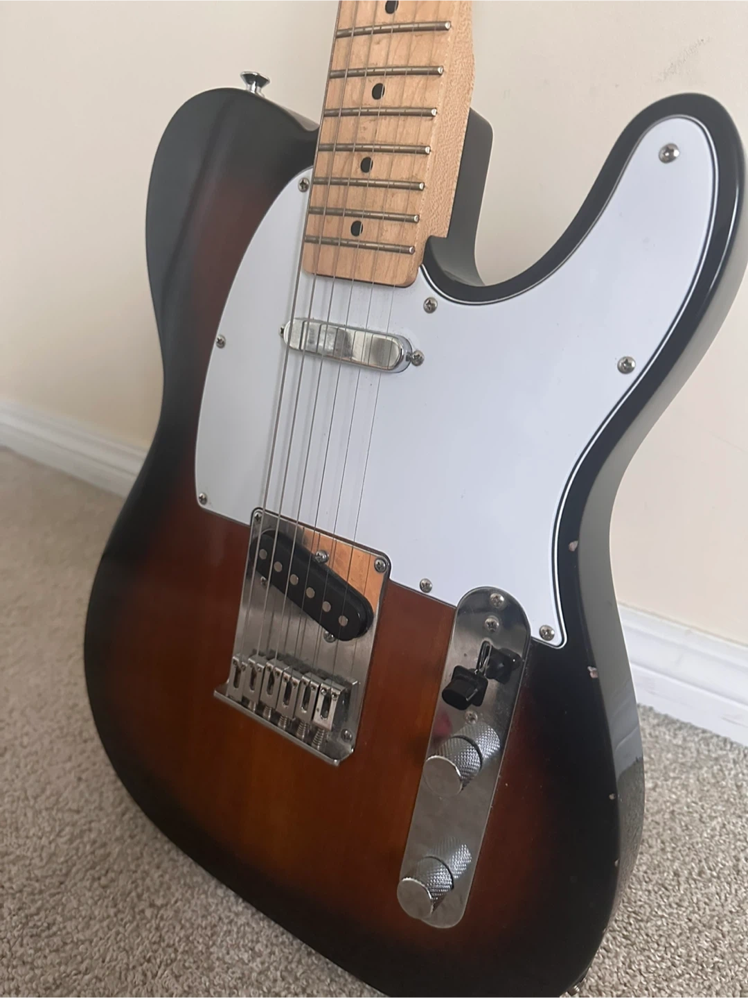 This Squier Telecaster electric guitar comes in a classic sunburst finish. It features a maple neck and fretboard with 21 frets. It's ready for jamming!