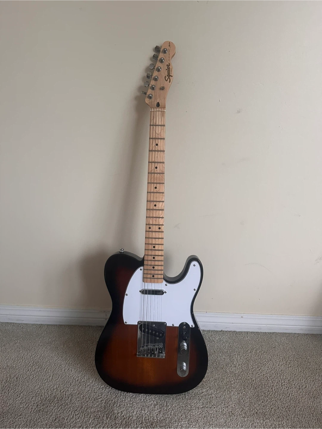 This Squier Telecaster electric guitar comes in a classic sunburst finish. It features a maple neck and fretboard with 21 frets. It's ready for jamming!