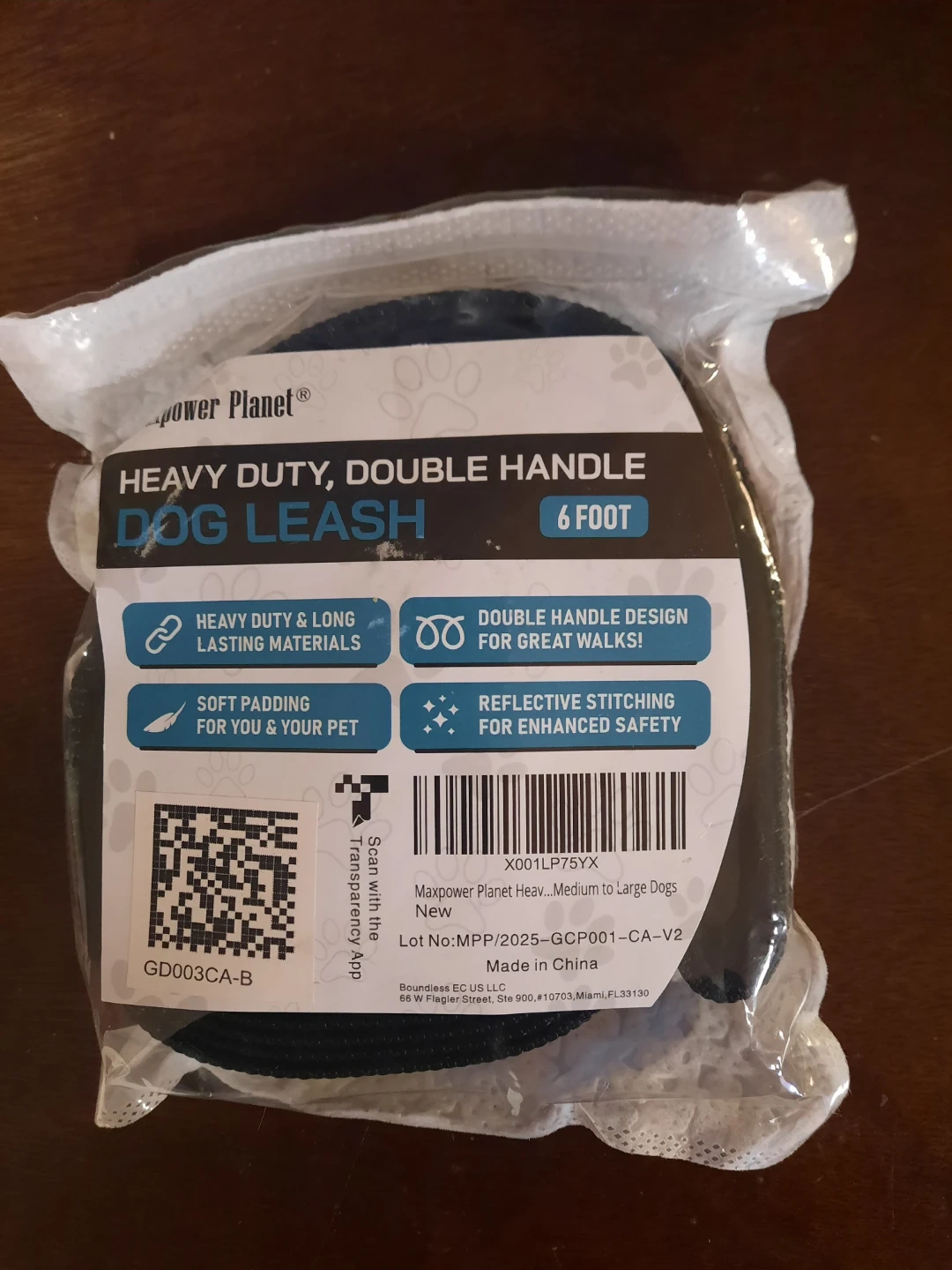 This is a heavy-duty dog leash with a double handle design. It's made with long-lasting materials and features soft padding for comfort. Reflective stitching is included for enhanced safety. Suitable for medium to large dogs.