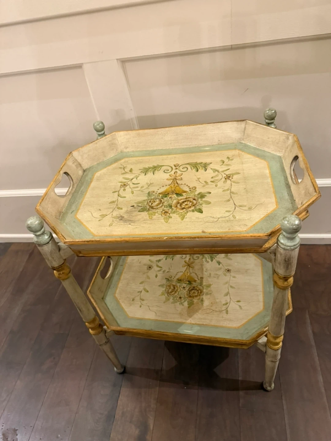 This decorative two-tiered tray table features a floral painted design on both octagonal surfaces. It has cut-out handles on the top tray and sits on four turned legs. Wood construction with a distressed painted finish. Perfect for serving snacks or displaying decor!