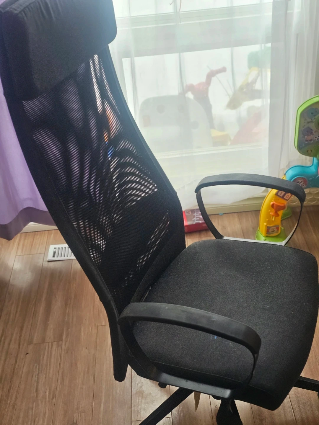 It is in very good condition. Ergonomic office chair with a mesh back for breathability. Features adjustable armrests and a high back for support. Dark grey fabric seat and mesh back. Perfect for long hours at your desk!