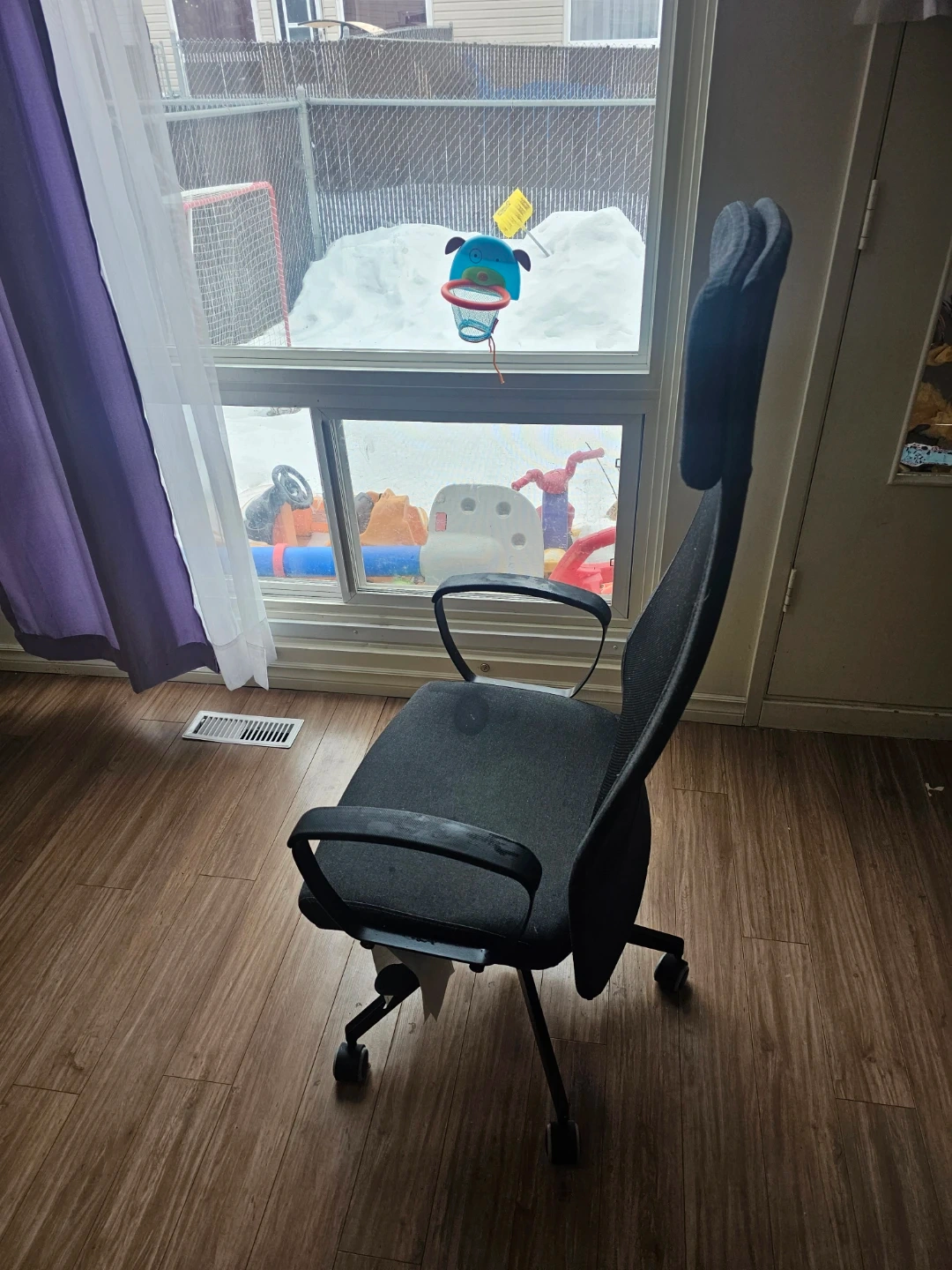 It is in very good condition. Ergonomic office chair with a mesh back for breathability. Features adjustable armrests and a high back for support. Dark grey fabric seat and mesh back. Perfect for long hours at your desk!