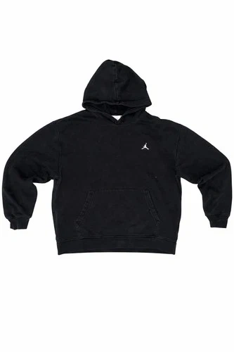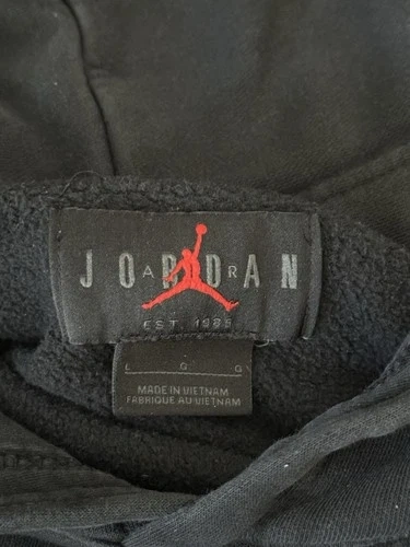 Jordan hoodie in grey with black sleeves. Size L on tag, fits closer to a Medium. Clean overall condition with normal signs of wear. No holes or major flaws. Soft fleece interior, comfortable everyday hoodie.