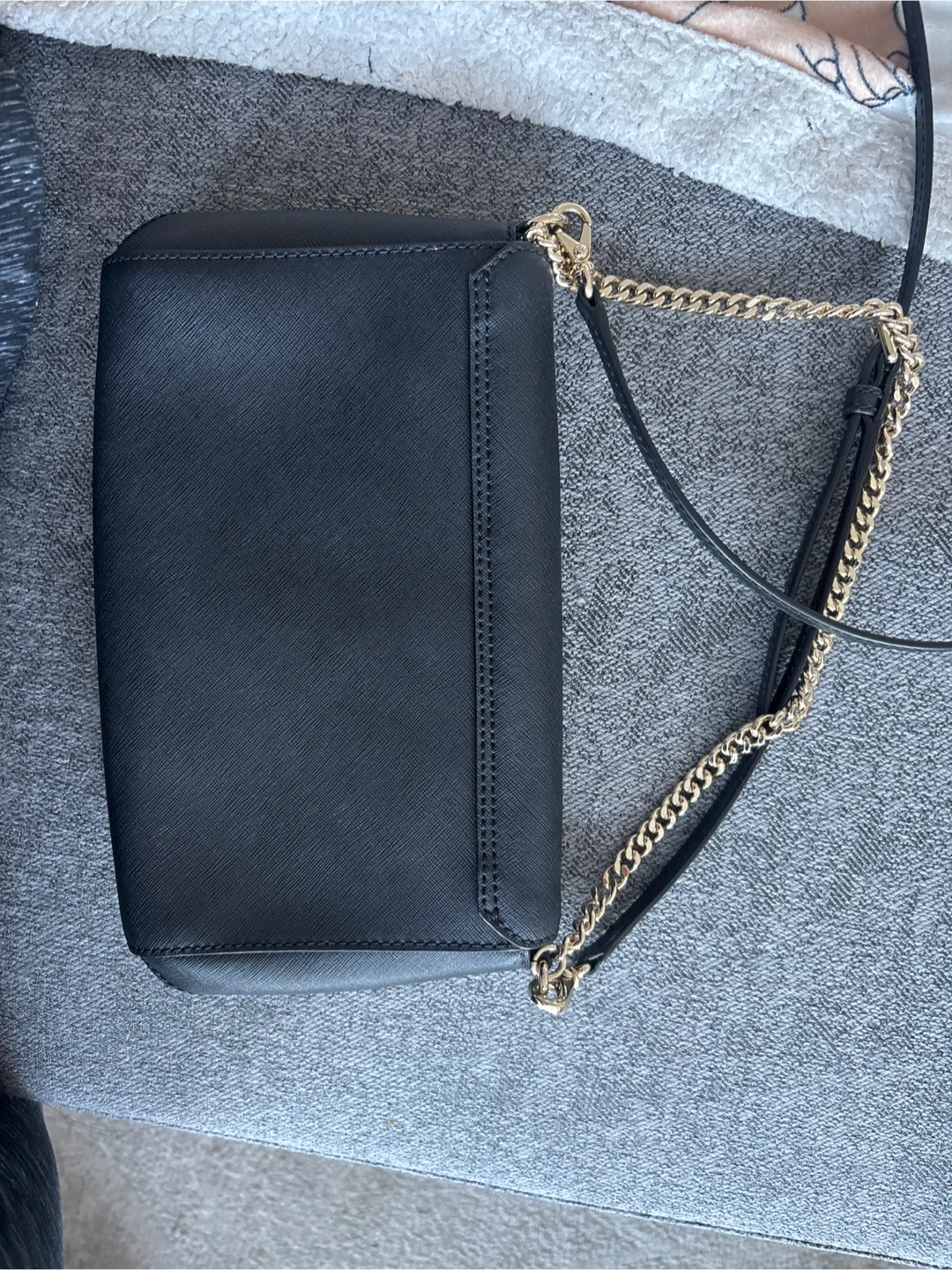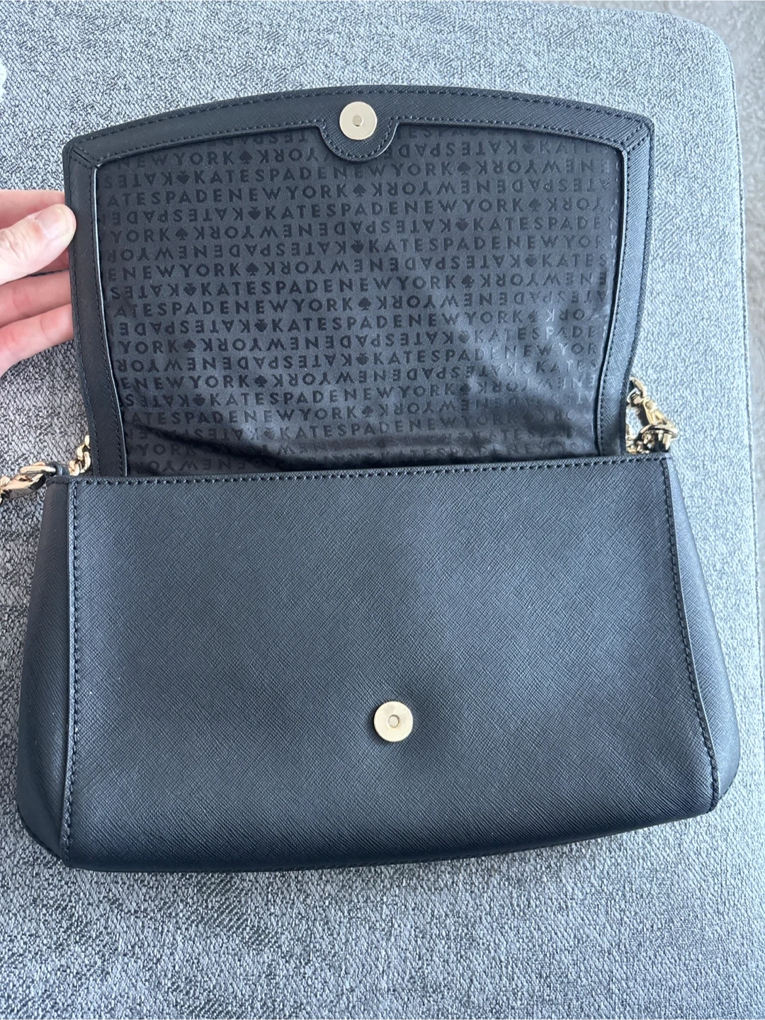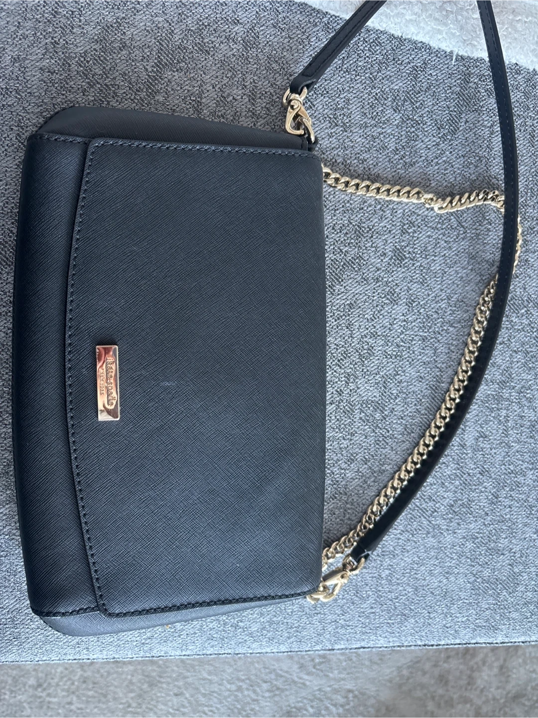 This is a black Kate Spade crossbody bag with gold chain detailing. It's made of Saffiano leather and features interior pockets. Great for a night out!