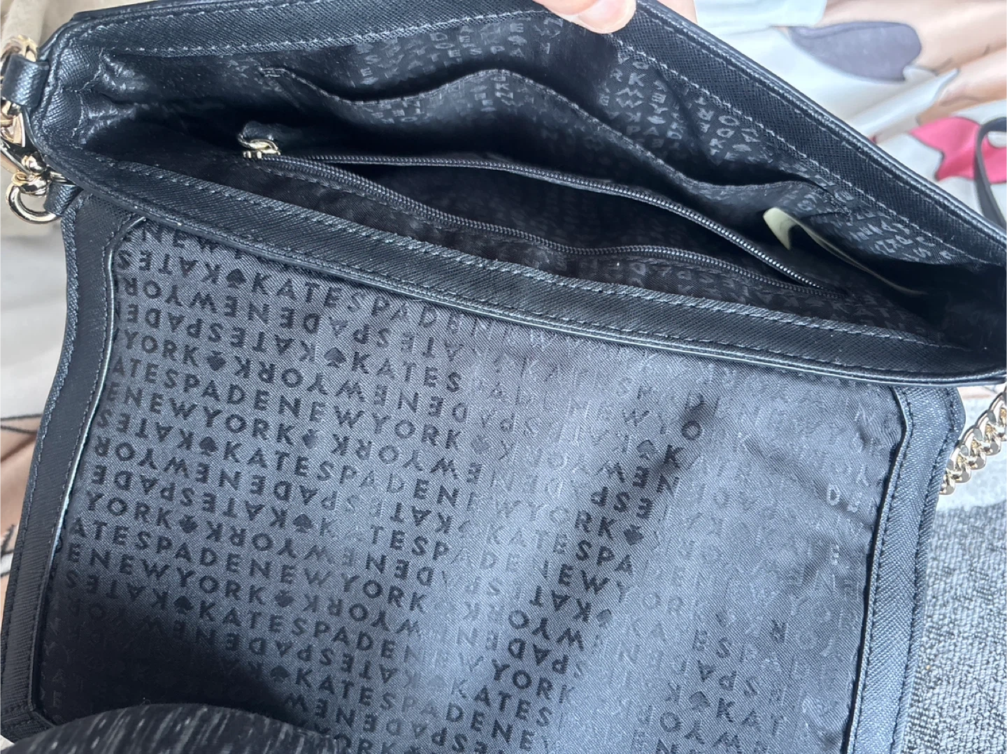 This is a black Kate Spade crossbody bag with gold chain detailing. It's made of Saffiano leather and features interior pockets. Great for a night out!