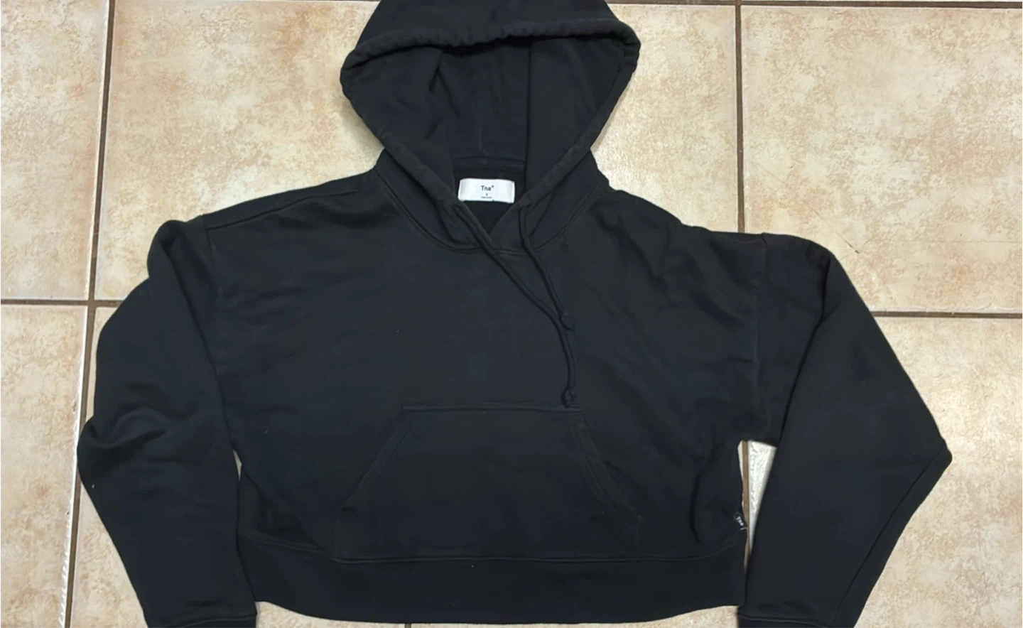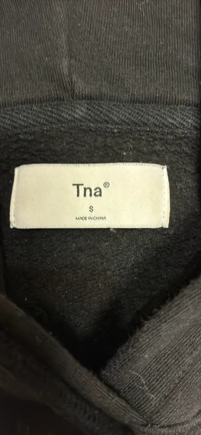 This is a black cropped hoodie from Tna. It's a size small and It features a front pocket and a drawstring hood.