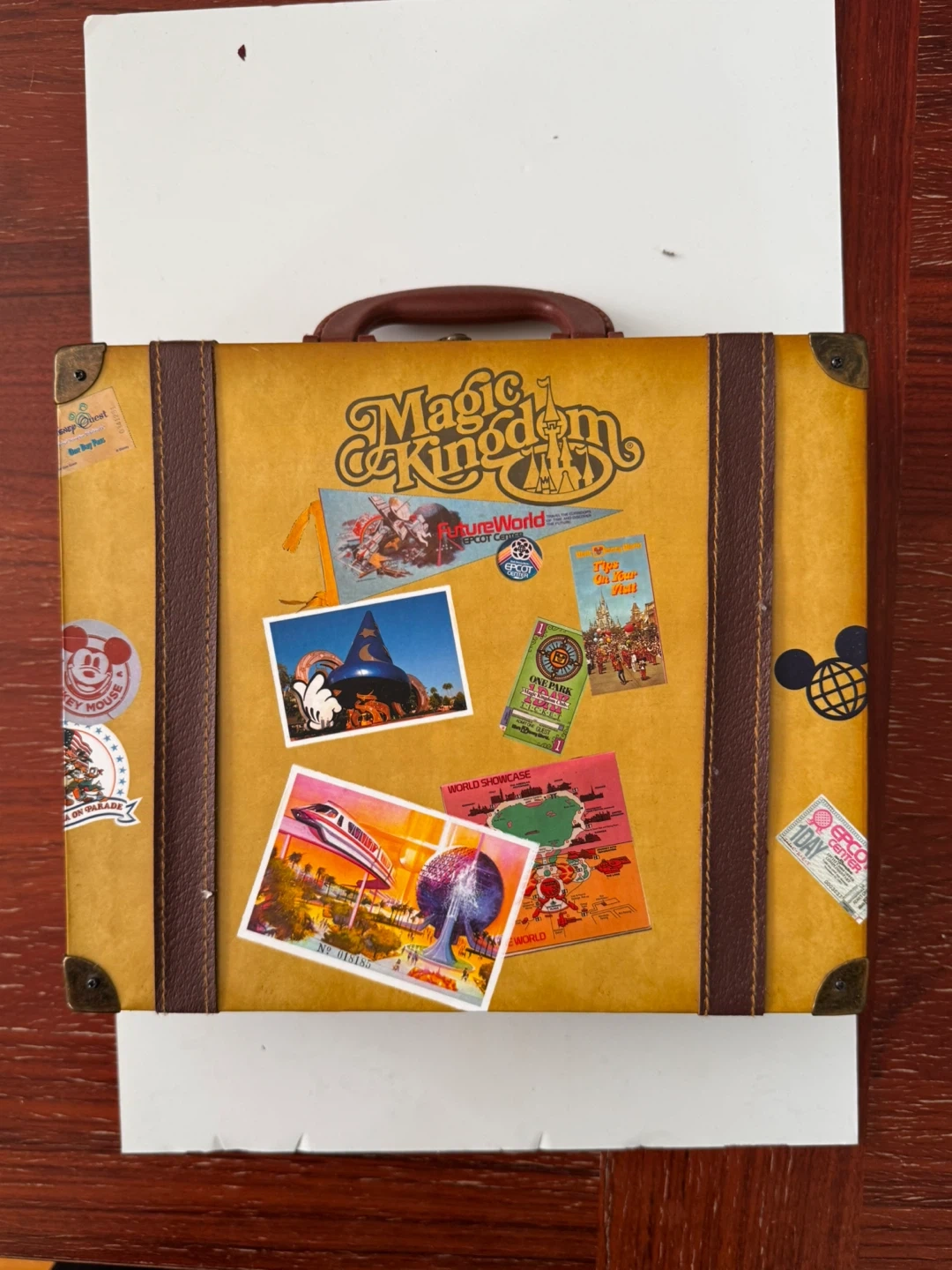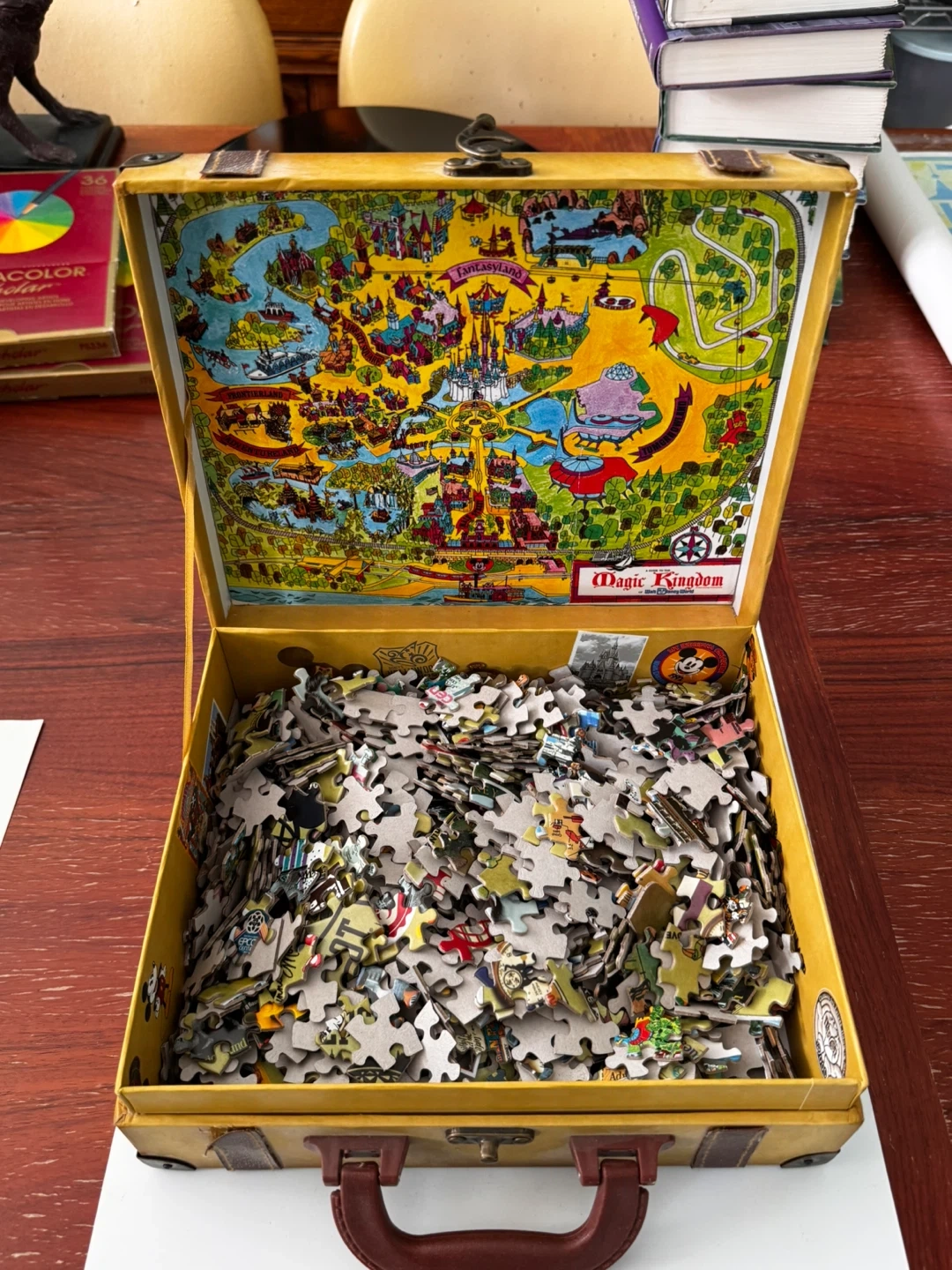 This is a Magic Kingdom puzzle housed in a decorative suitcase. The suitcase is covered in vintage Disney park stickers. It's a fun collectible for any Disney enthusiast! Purchased 2011 during the 40th Anniversary event