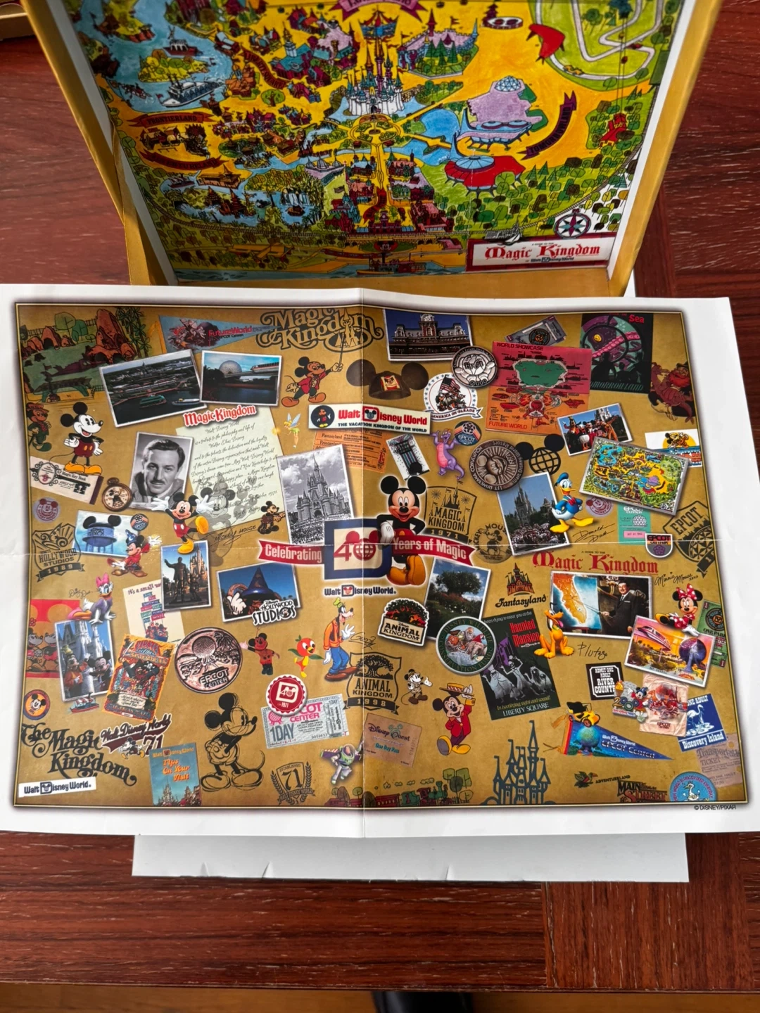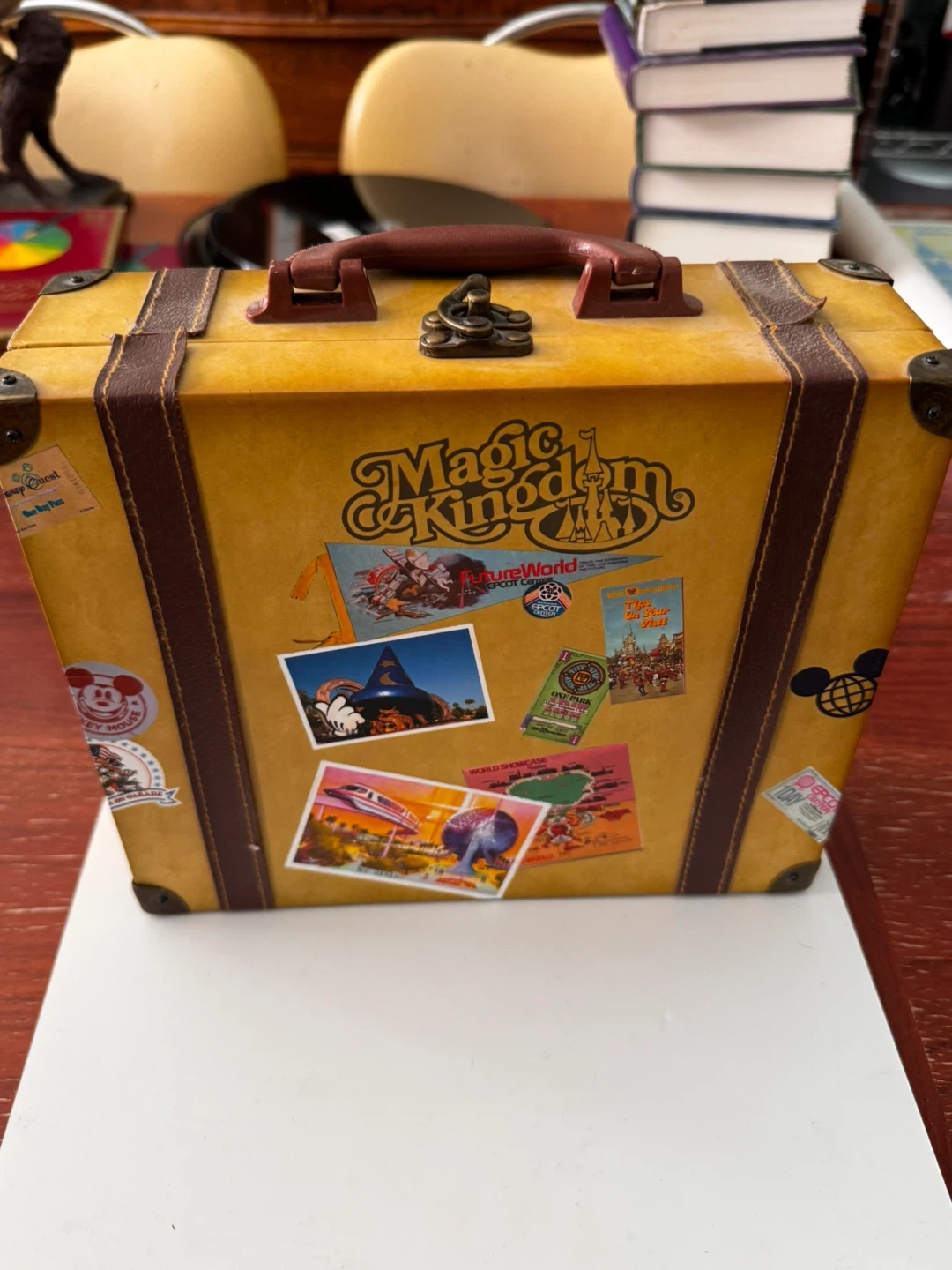 This is a Magic Kingdom puzzle housed in a decorative suitcase. The suitcase is covered in vintage Disney park stickers. It's a fun collectible for any Disney enthusiast! Purchased 2011 during the 40th Anniversary event