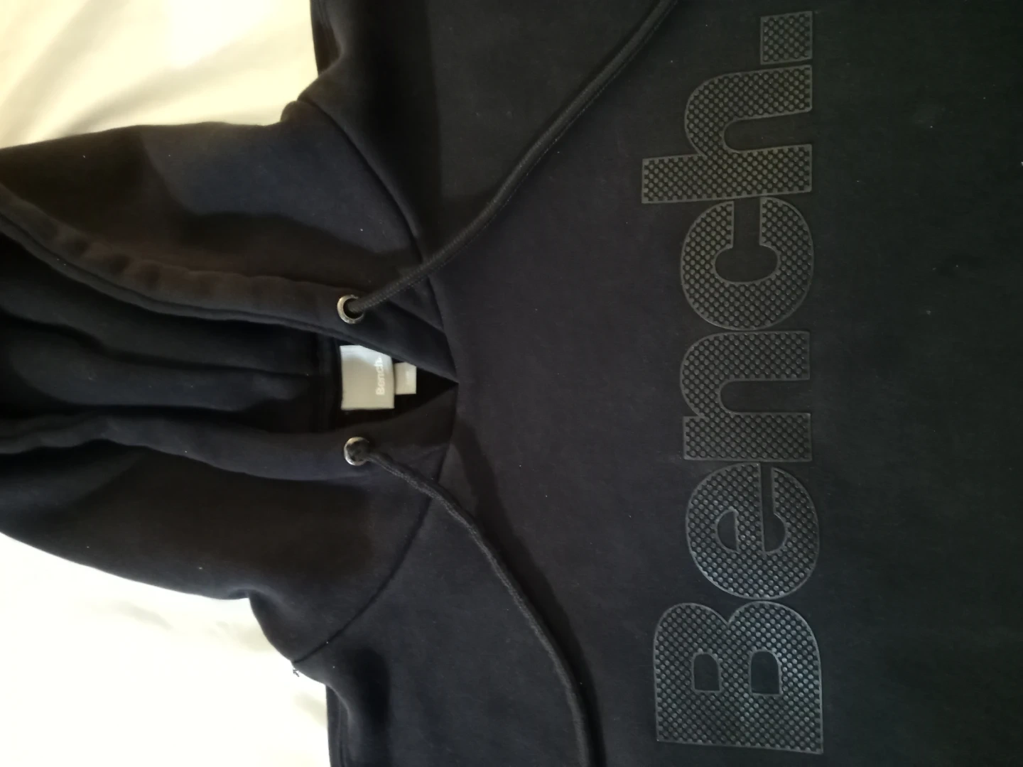 Black Bench hoodie with a large logo on the front. It features a drawstring hood and a front pouch pocket. It's made from a soft cotton blend.
