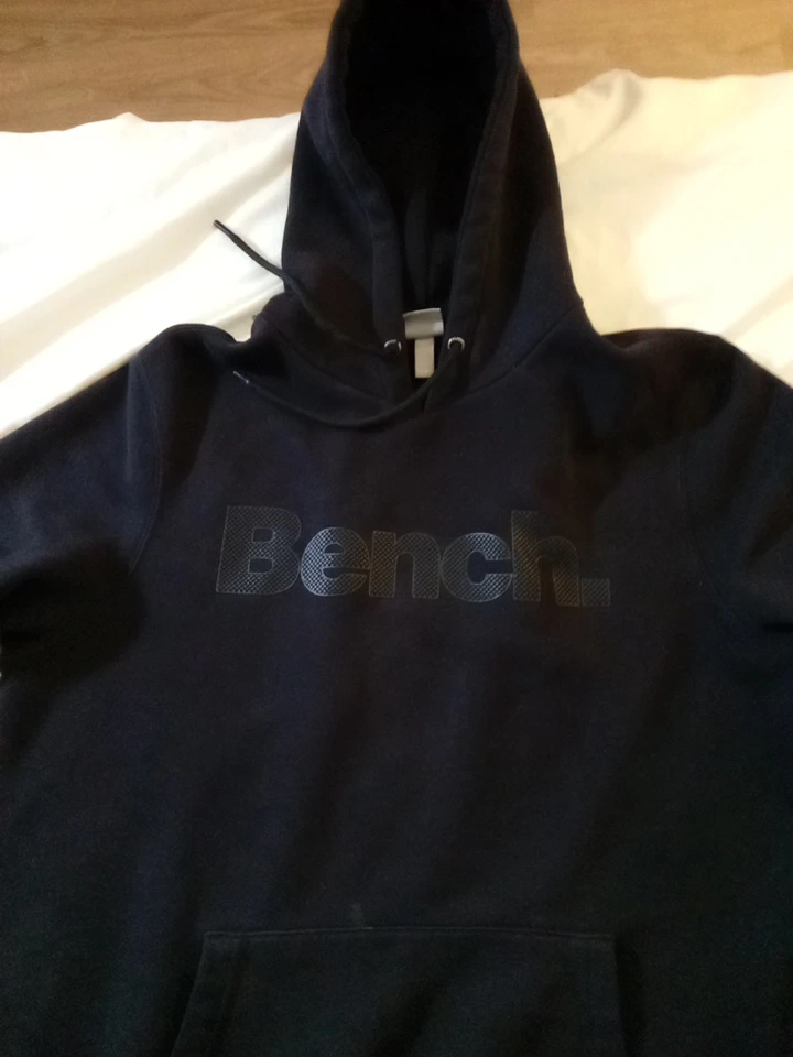 Black Bench hoodie with a large logo on the front. It features a drawstring hood and a front pouch pocket. It's made from a soft cotton blend.