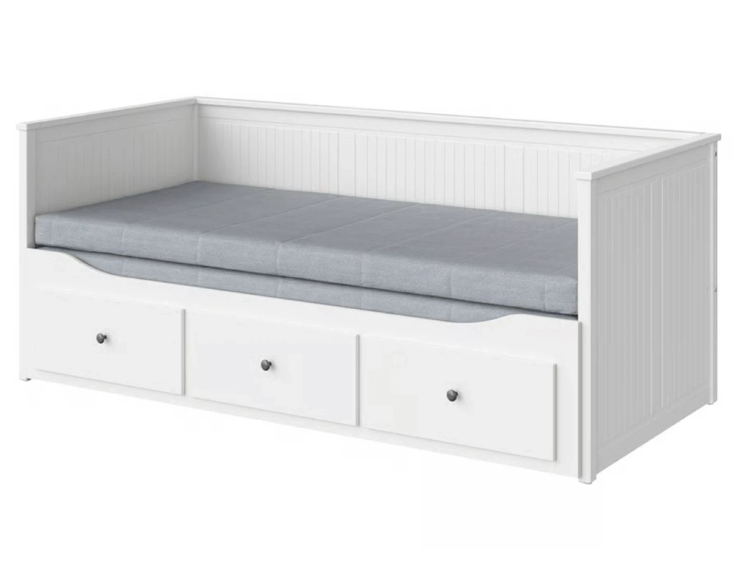 This is white IKEA daybed with three drawers for storage. It's great for a bedroom or guest room. It features a simple, classic design. It’s in good conditions and a great piece for those who have limited space for furniture.