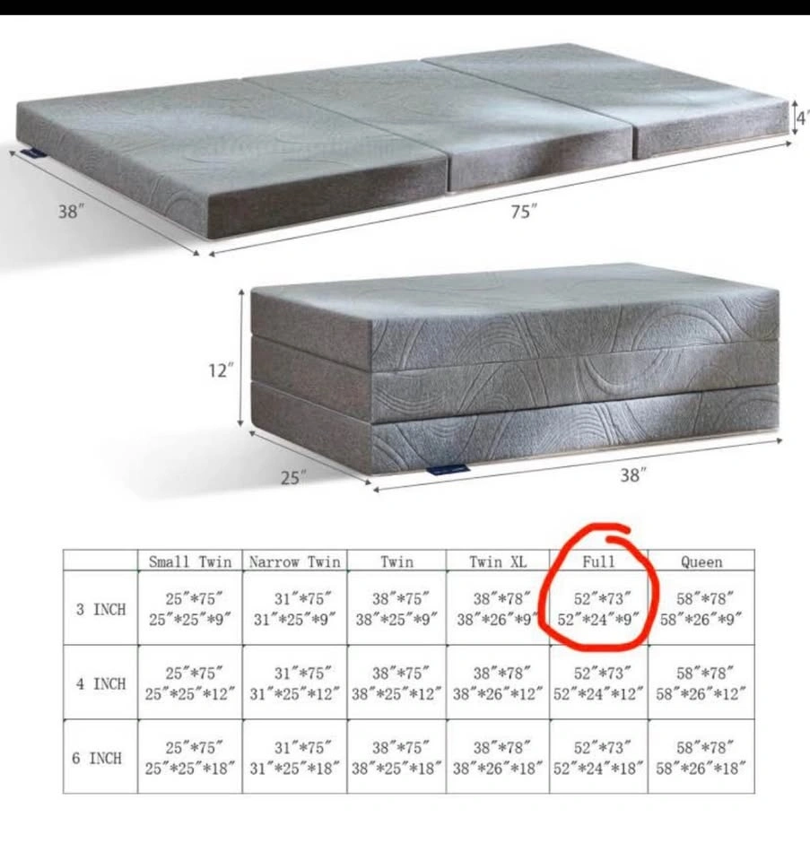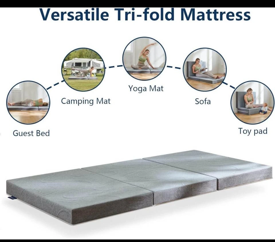 Comfy full size tri-fold mattress. Brand new, still in plastic wrap. Medium firmness, great for guests or camping. Made with gel memory foam and support foam, plus a soft breathable fabric. Bottom is non-slip.