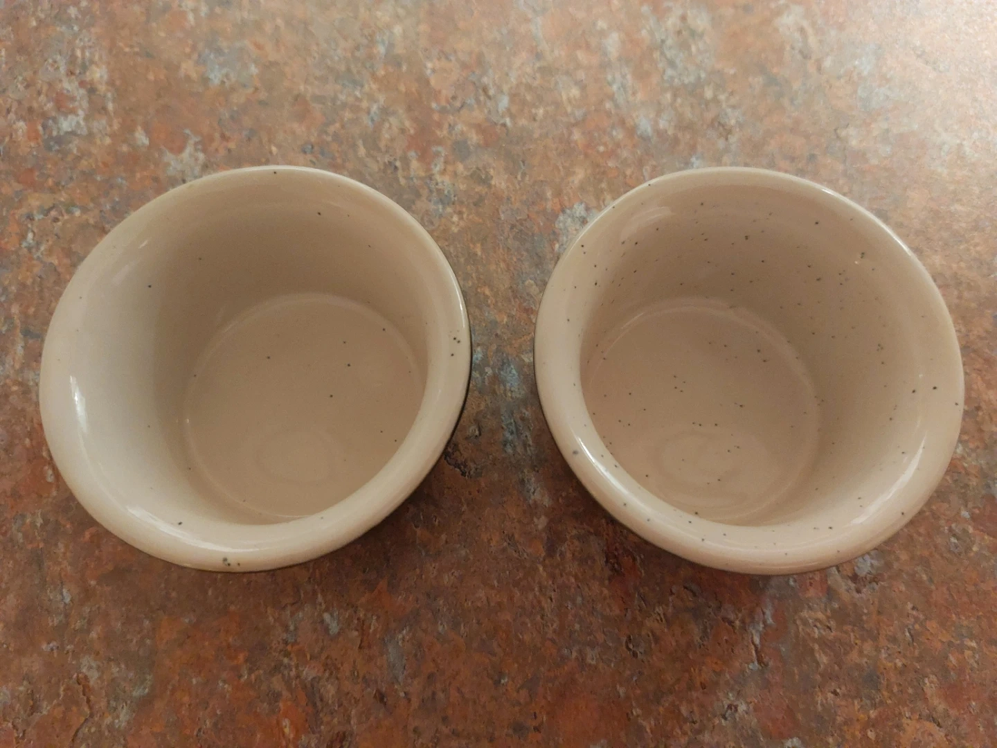 $10 - Here's a set of two ramekins. They're a lovely cream colour with speckles on the inside and dark green on the outside. Great for baking or serving. 3 inches in diameter.