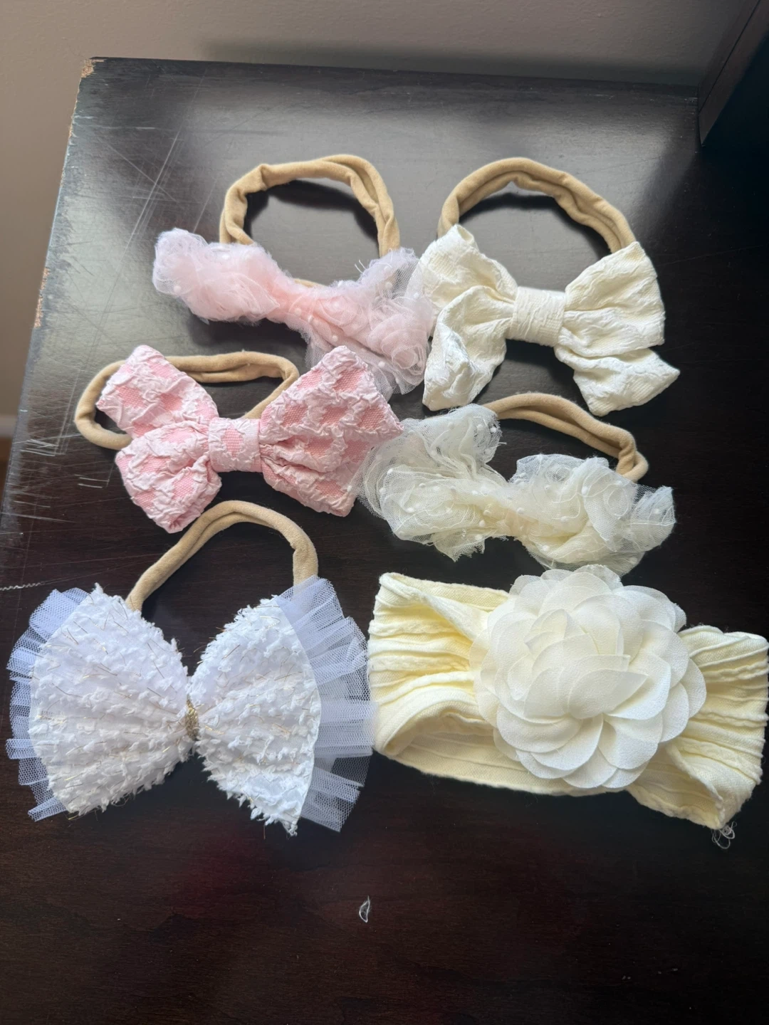 A set of 6 darling baby headbands and bows. Includes pink, white, and ivory styles with various textures like lace and tulle. They feature soft, stretchy bands for comfort. Perfect for dressing up little ones!
