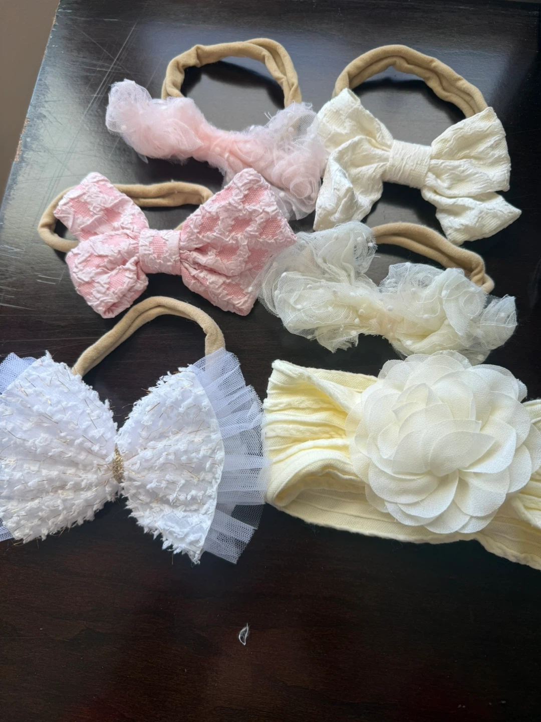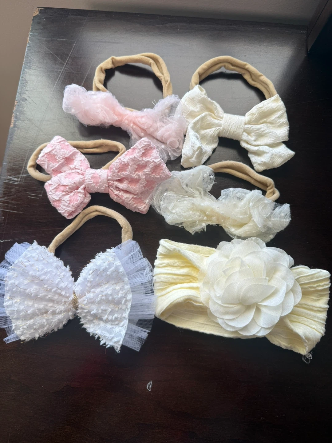A set of 6 darling baby headbands and bows. Includes pink, white, and ivory styles with various textures like lace and tulle. They feature soft, stretchy bands for comfort. Perfect for dressing up little ones!