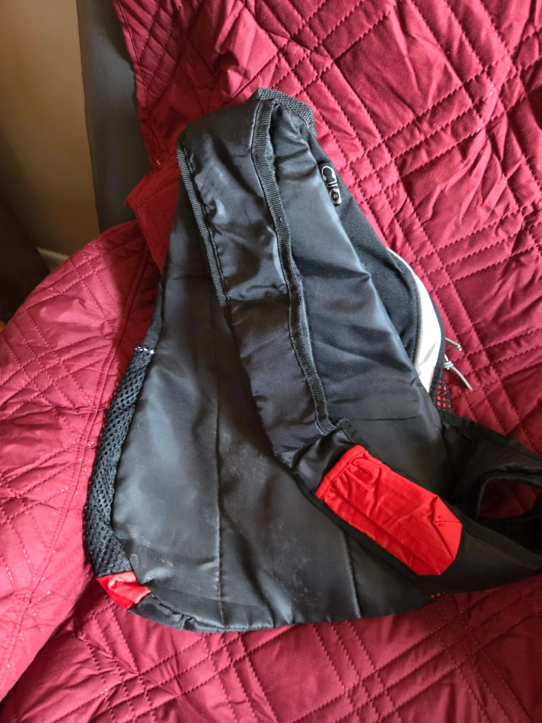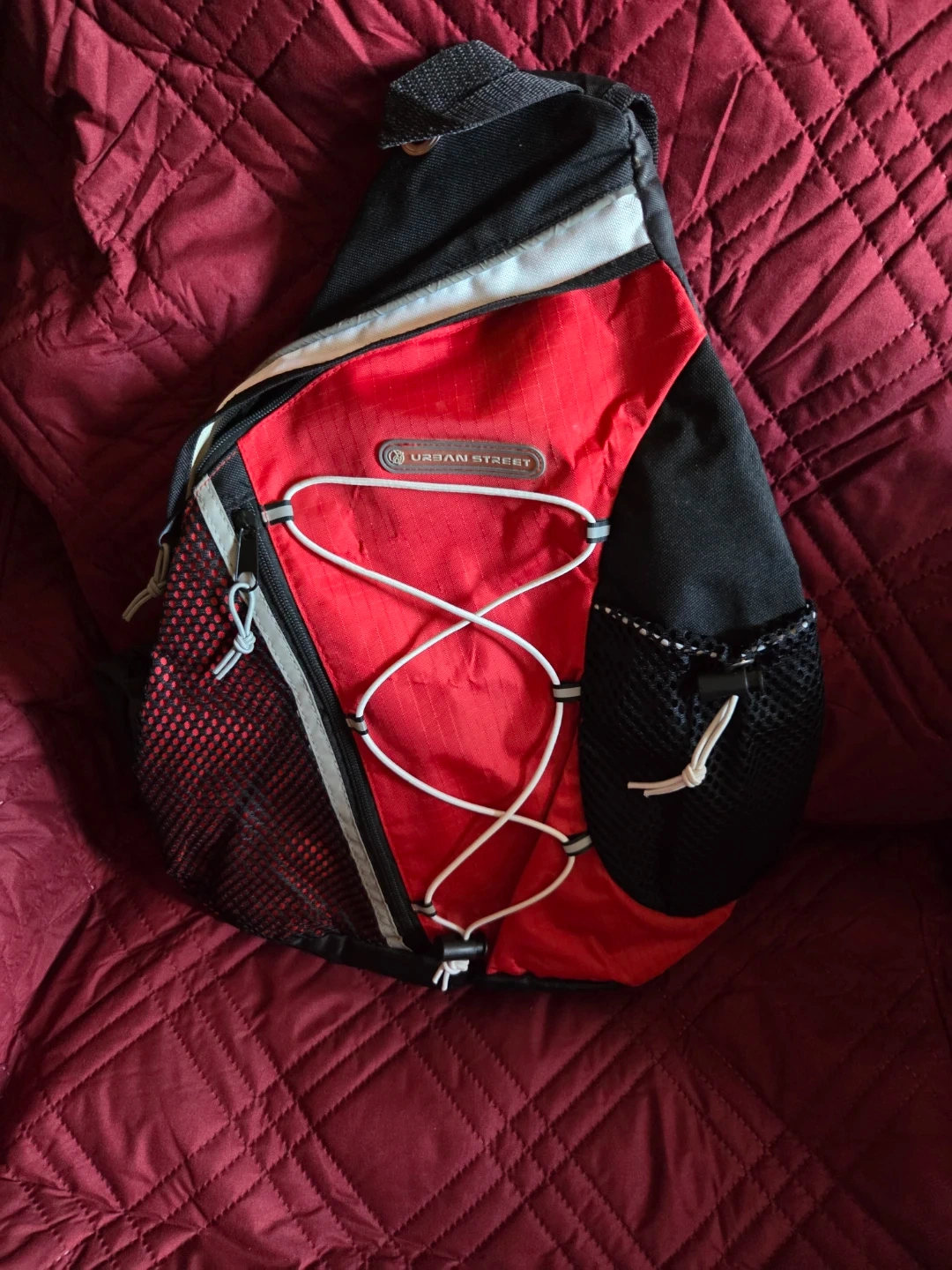 🤎#FREE This red and black sling bag from Urban Street features a sporty design with bungee cord accents. It has mesh side pockets for extra storage. Great for everyday use or light outdoor activities!