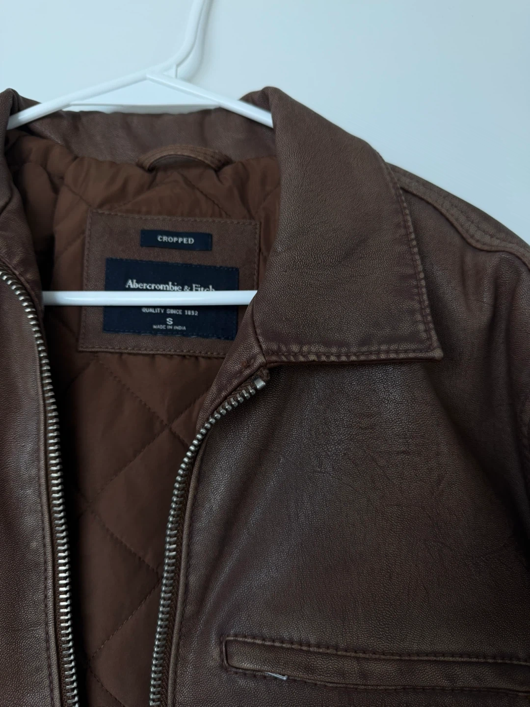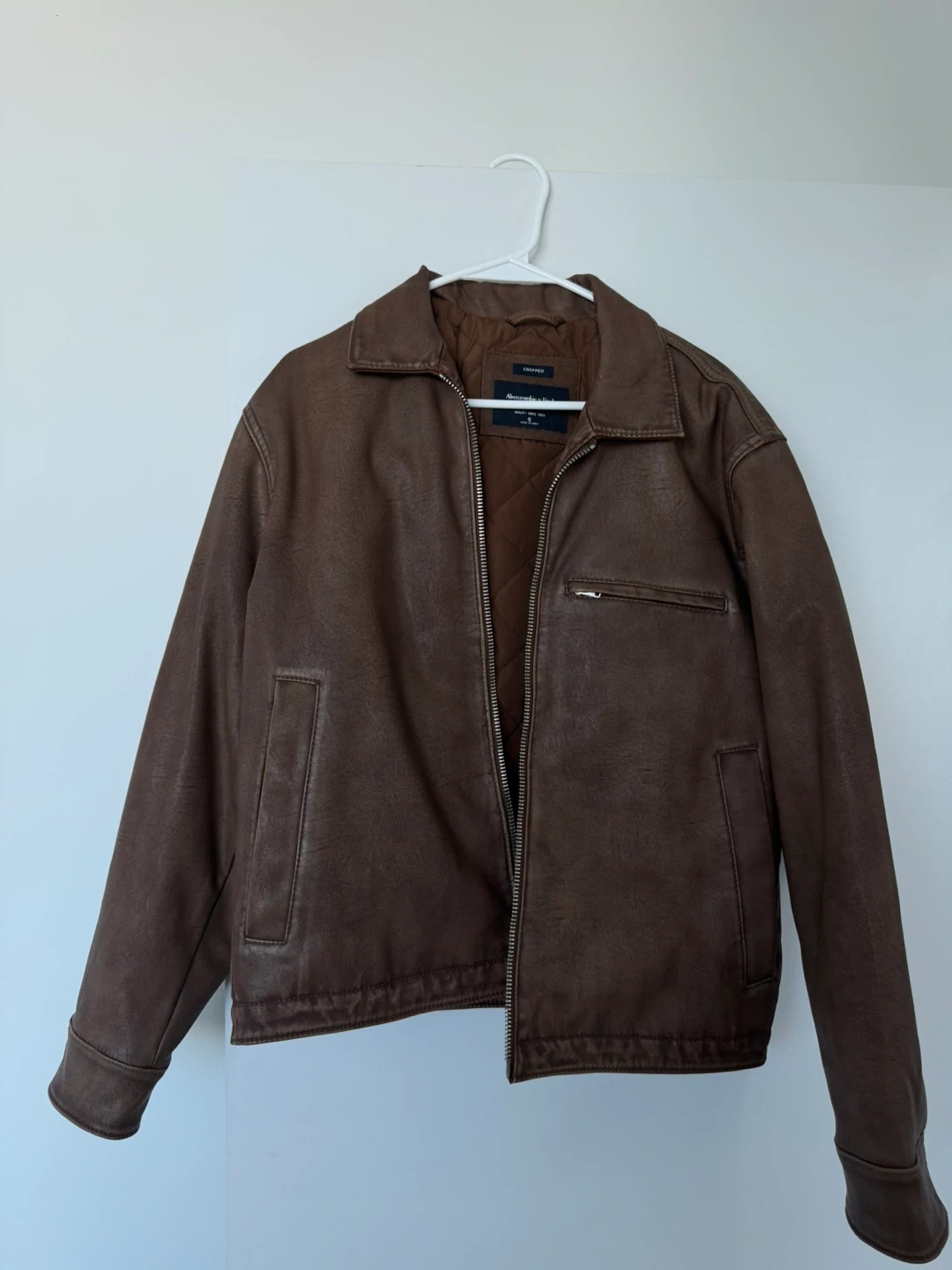 This Abercrombie & Fitch jacket is a cropped style with a faux leather exterior. It features a full zip closure and a quilted lining.