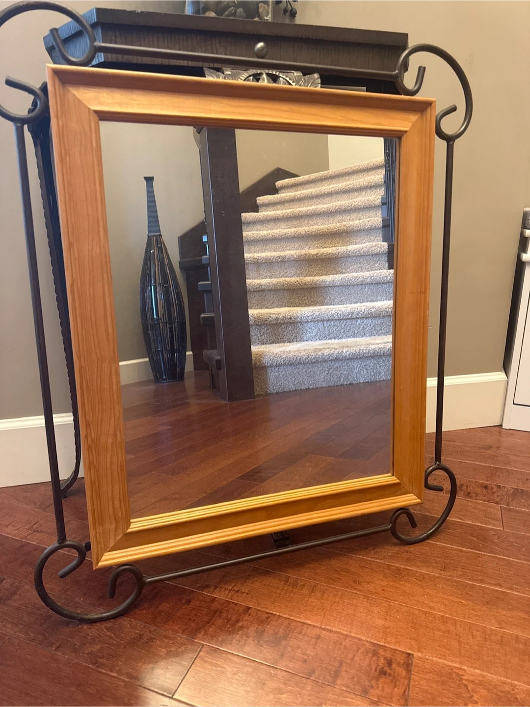 Mirror with a light wooden frame and decorative metal stand. It's a lovely accent piece for any room. Measures approximately 18 inches by 24 inches.