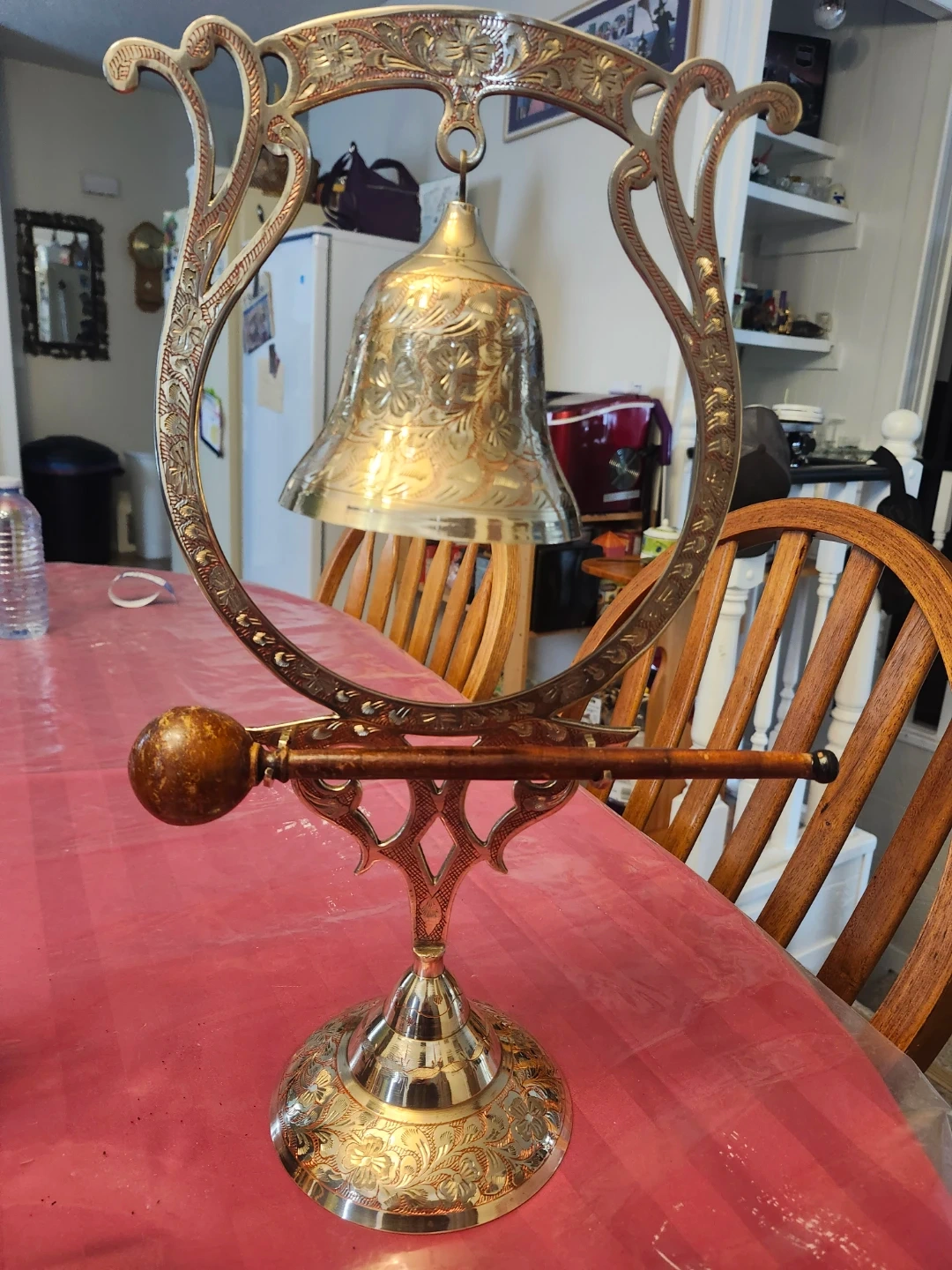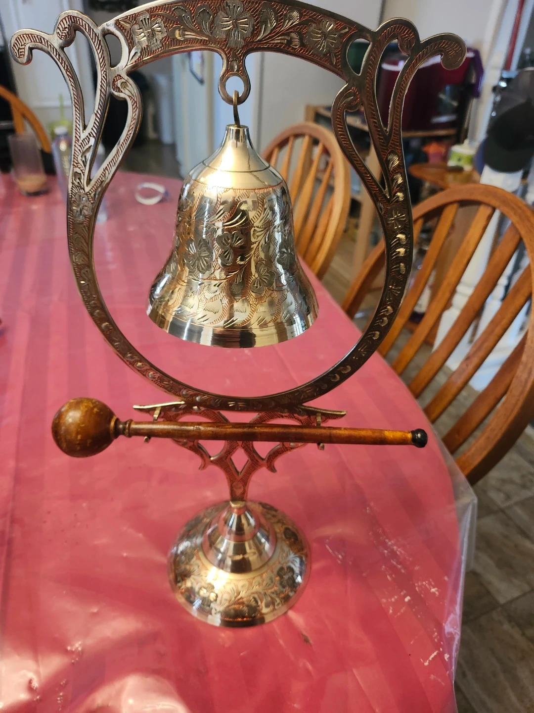 This is a decorative bell with a stand. It's made of brass and features intricate floral etchings. The stand is also ornately designed with a wooden striker. Adds a vintage touch to any space! Still functional as a bell
