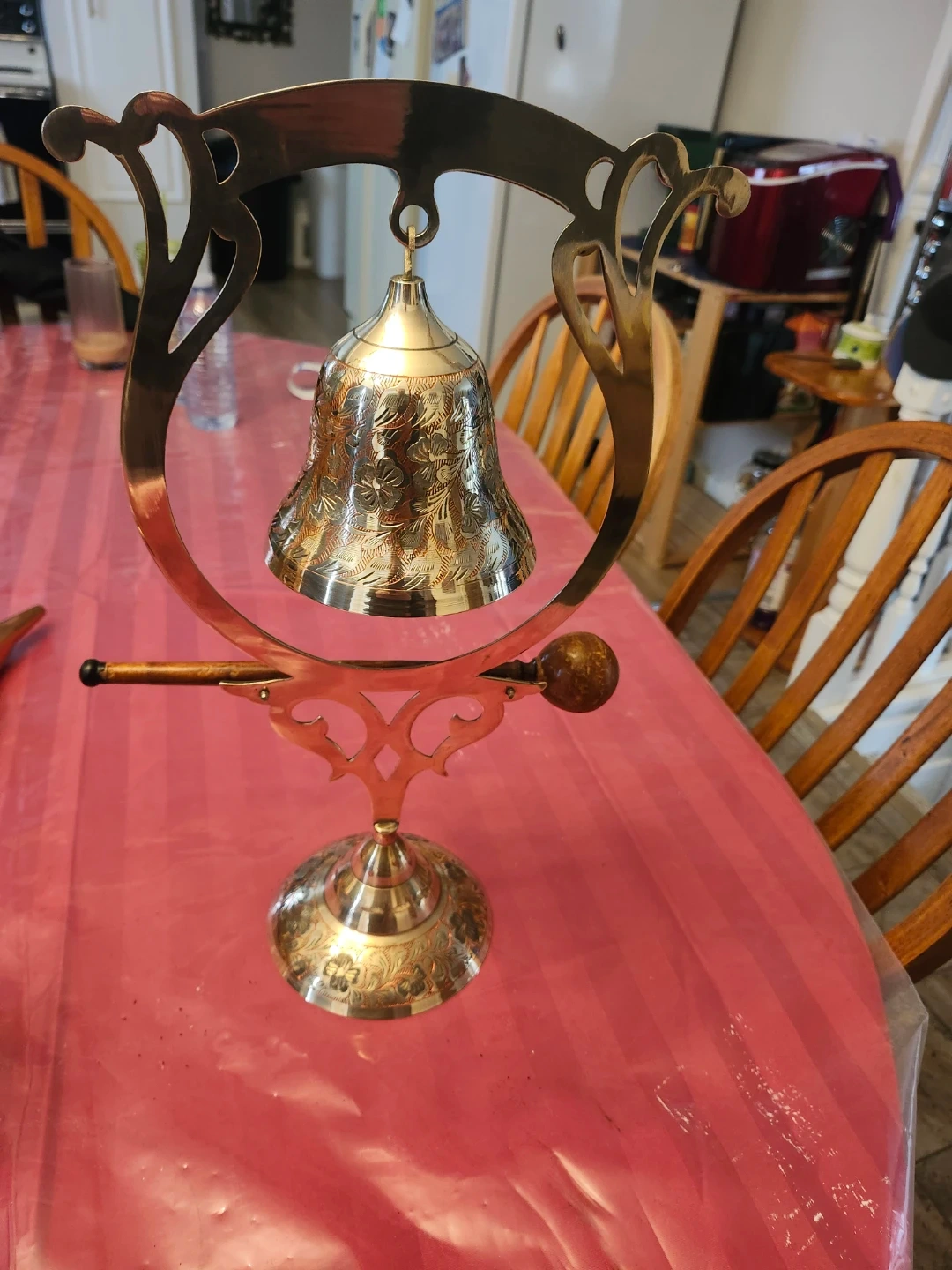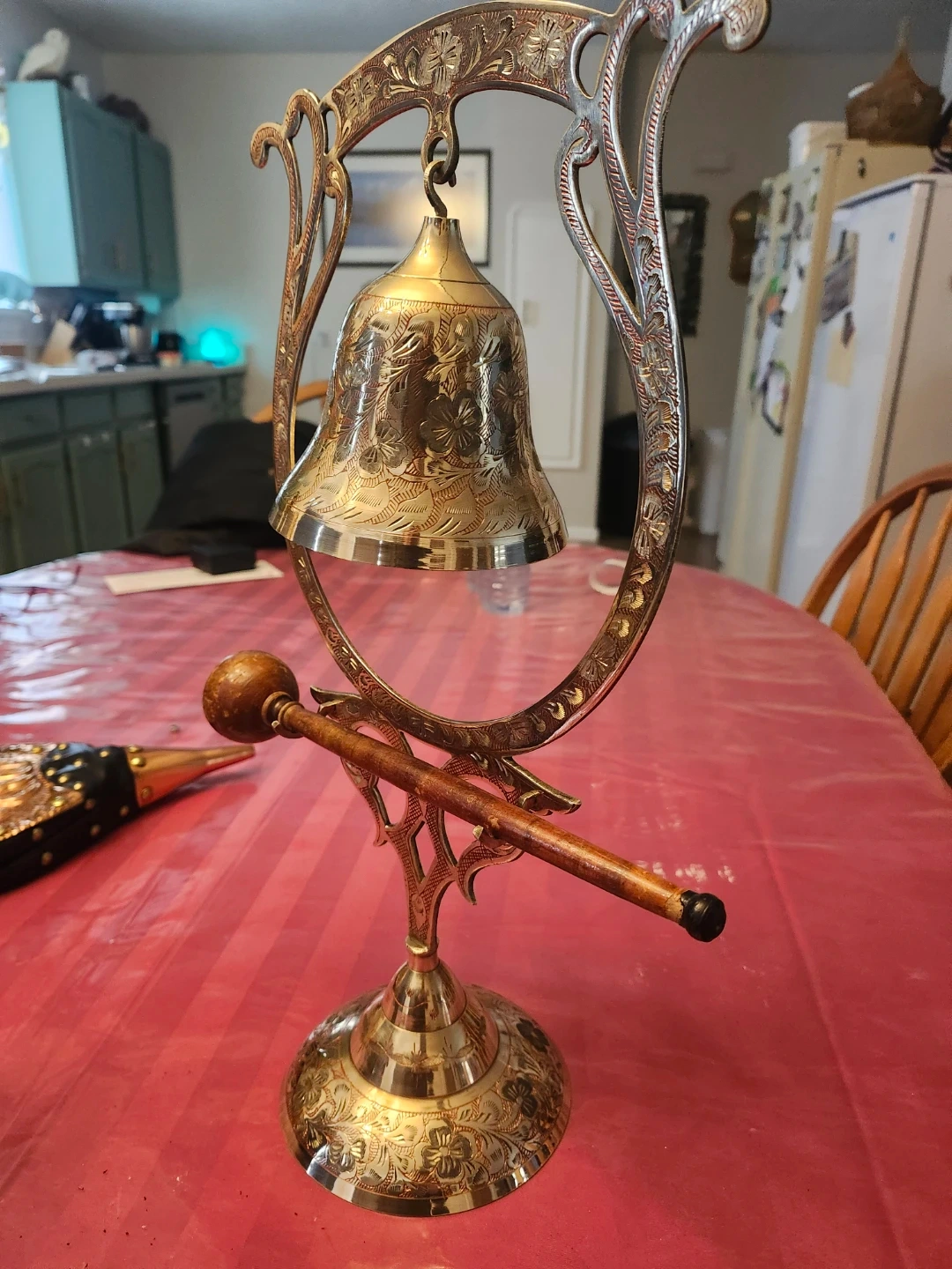 This is a decorative bell with a stand. It's made of brass and features intricate floral etchings. The stand is also ornately designed with a wooden striker. Adds a vintage touch to any space! Still functional as a bell