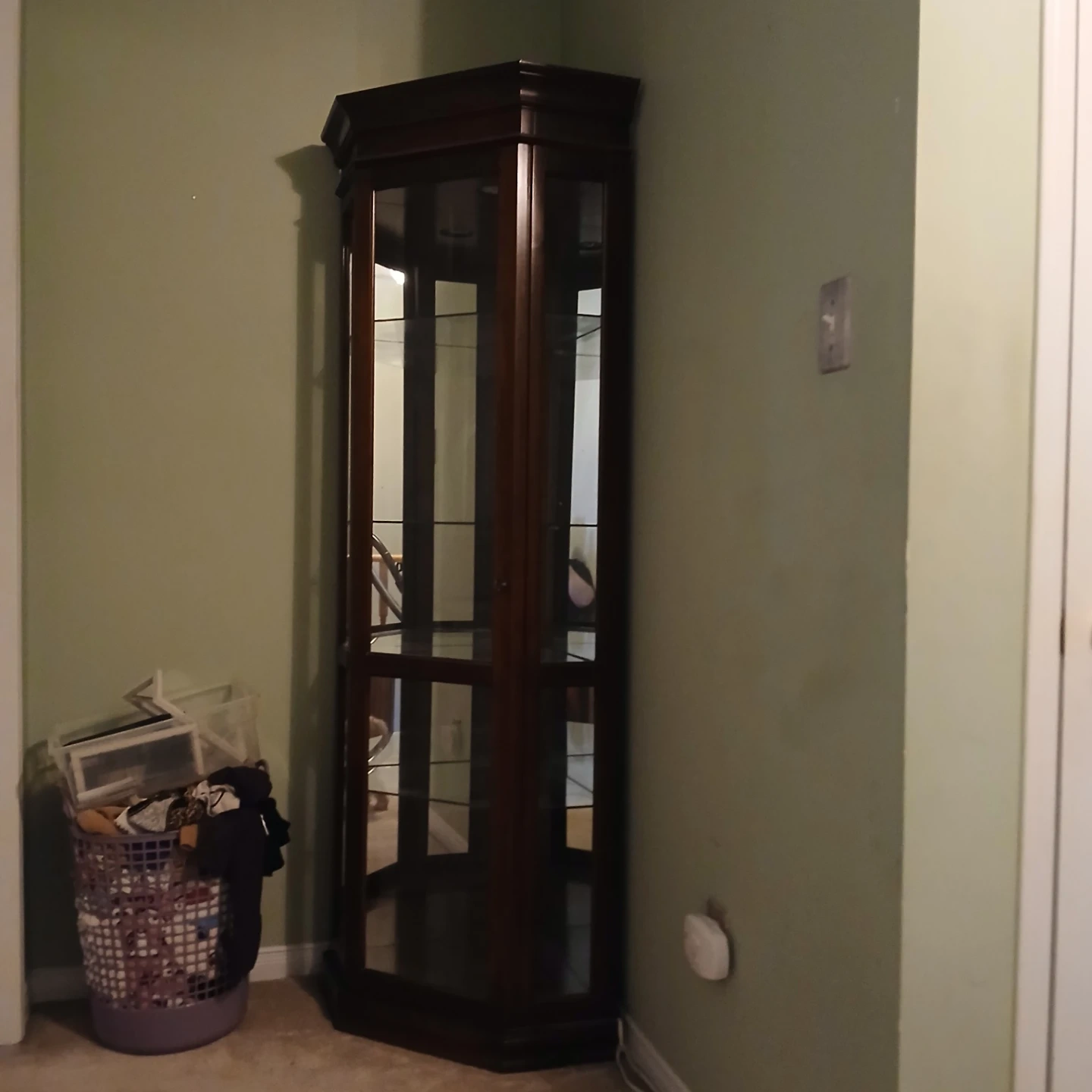 Dark wood corner display cabinet with glass doors and shelves. It's perfect for showcasing collectibles or decor items. This cabinet offers ample display space for your treasured items.
