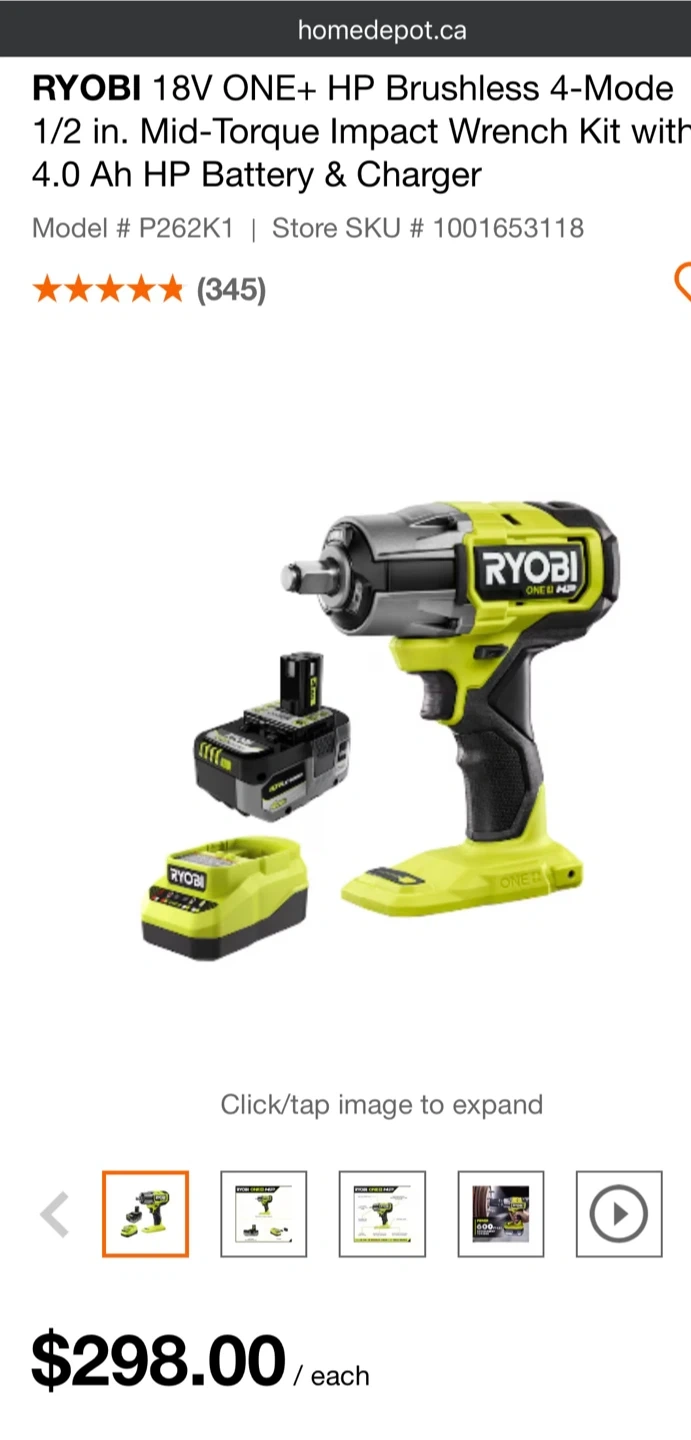 RYOBI 18V ONE+ HP Brushless 4-Mode 1/2 in. Mid-Torque Impact Wrench Kit with 4.0 Ah HP Battery & Charger