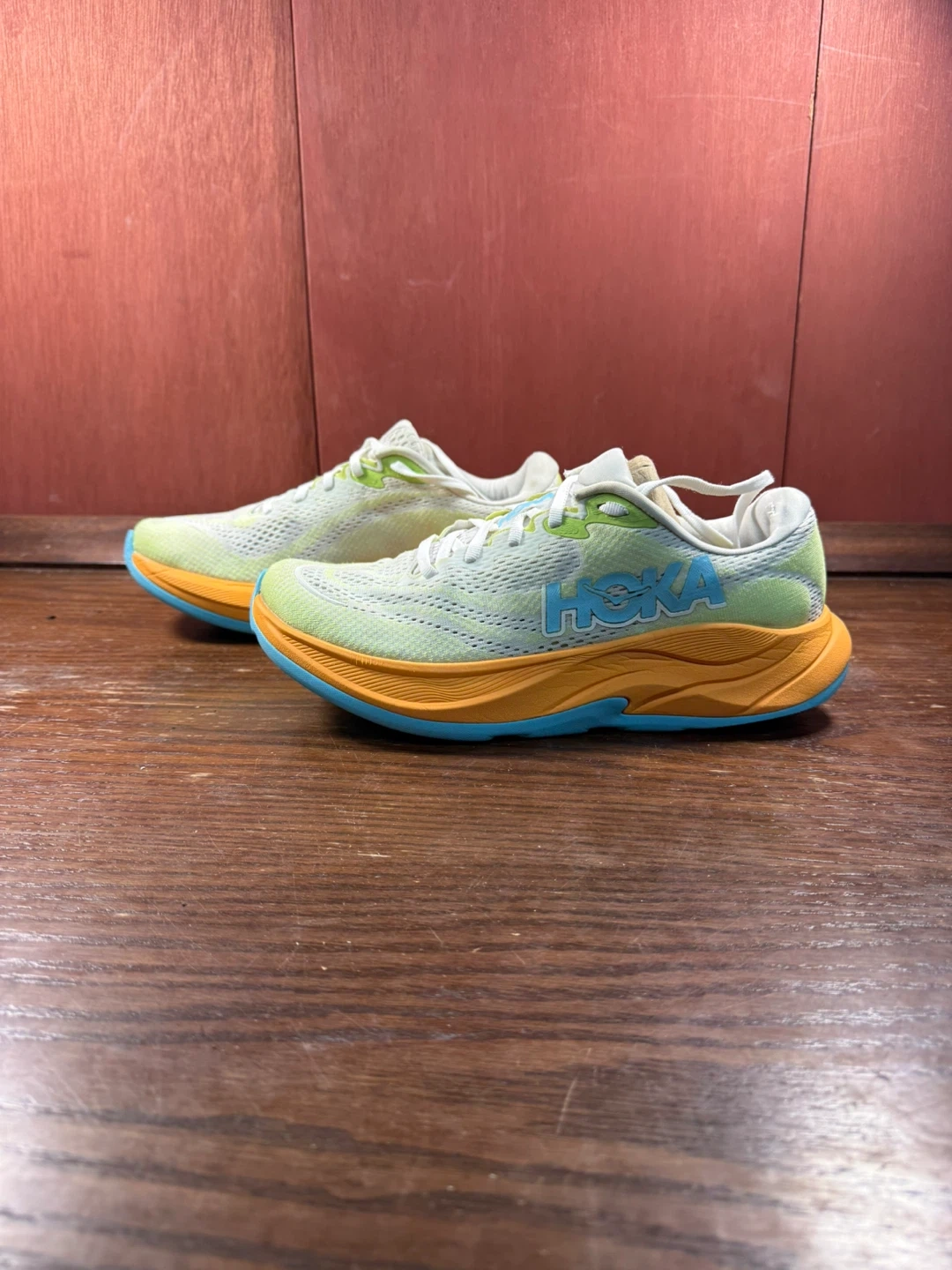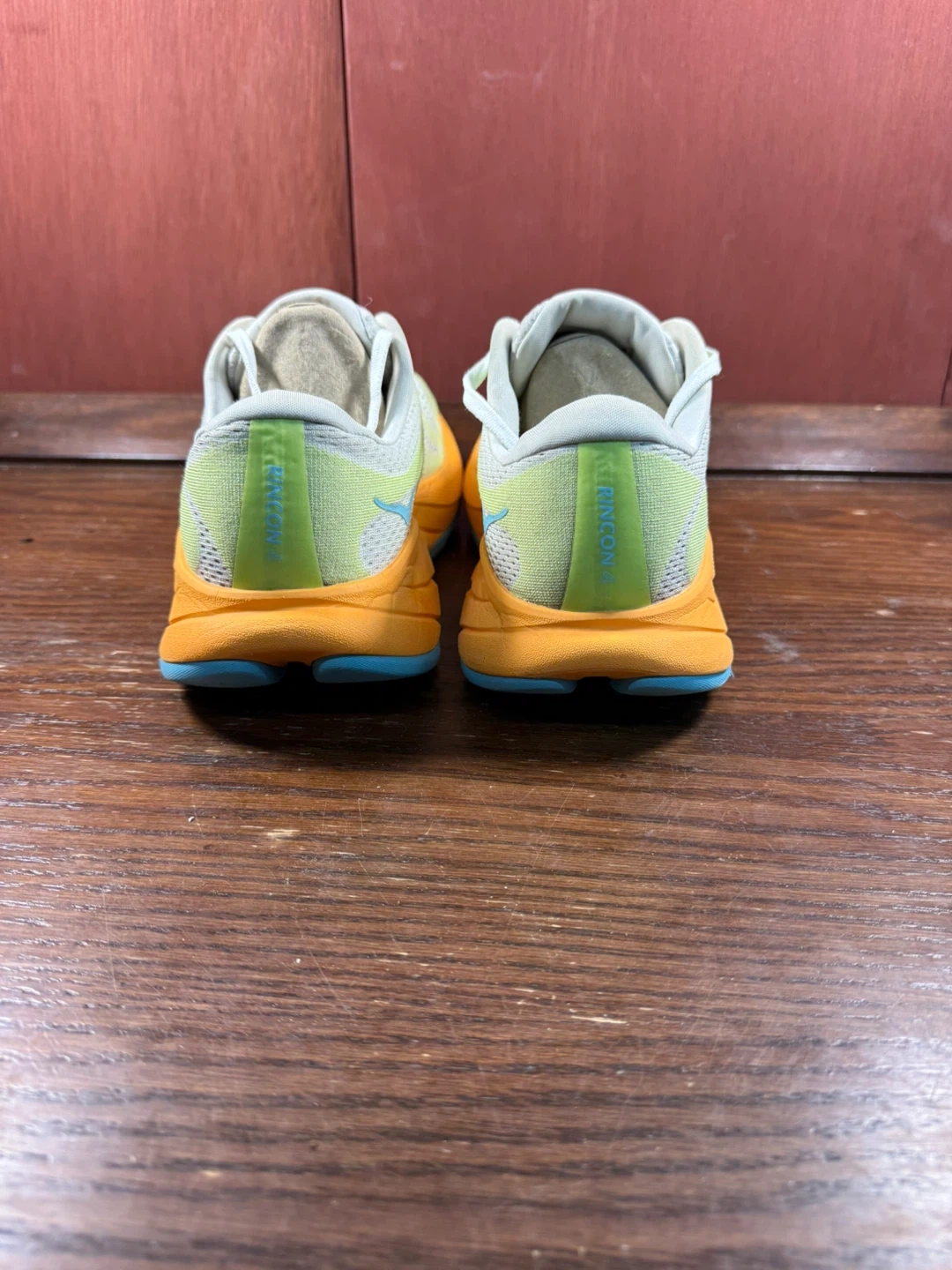 I'm selling a pair of Hoka One Men's Rincon 4 running shoes, size US 9D, style FTLT 1155131. These running shoes feature a lightweight design for a fast and responsive feel, perfect for training or racing. They show signs of wear from previous use but still have plenty of miles left.