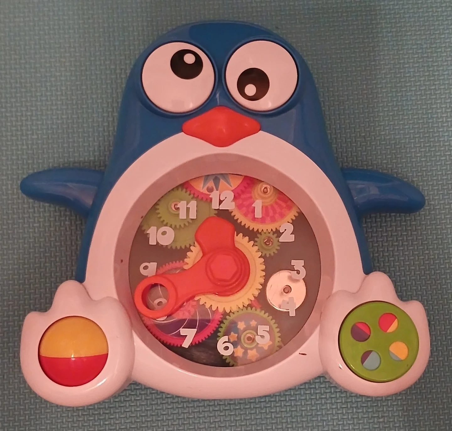 This is a fun penguin-shaped learning clock toy with colourful spinning gears. It has interactive activities on its feet for added engagement.