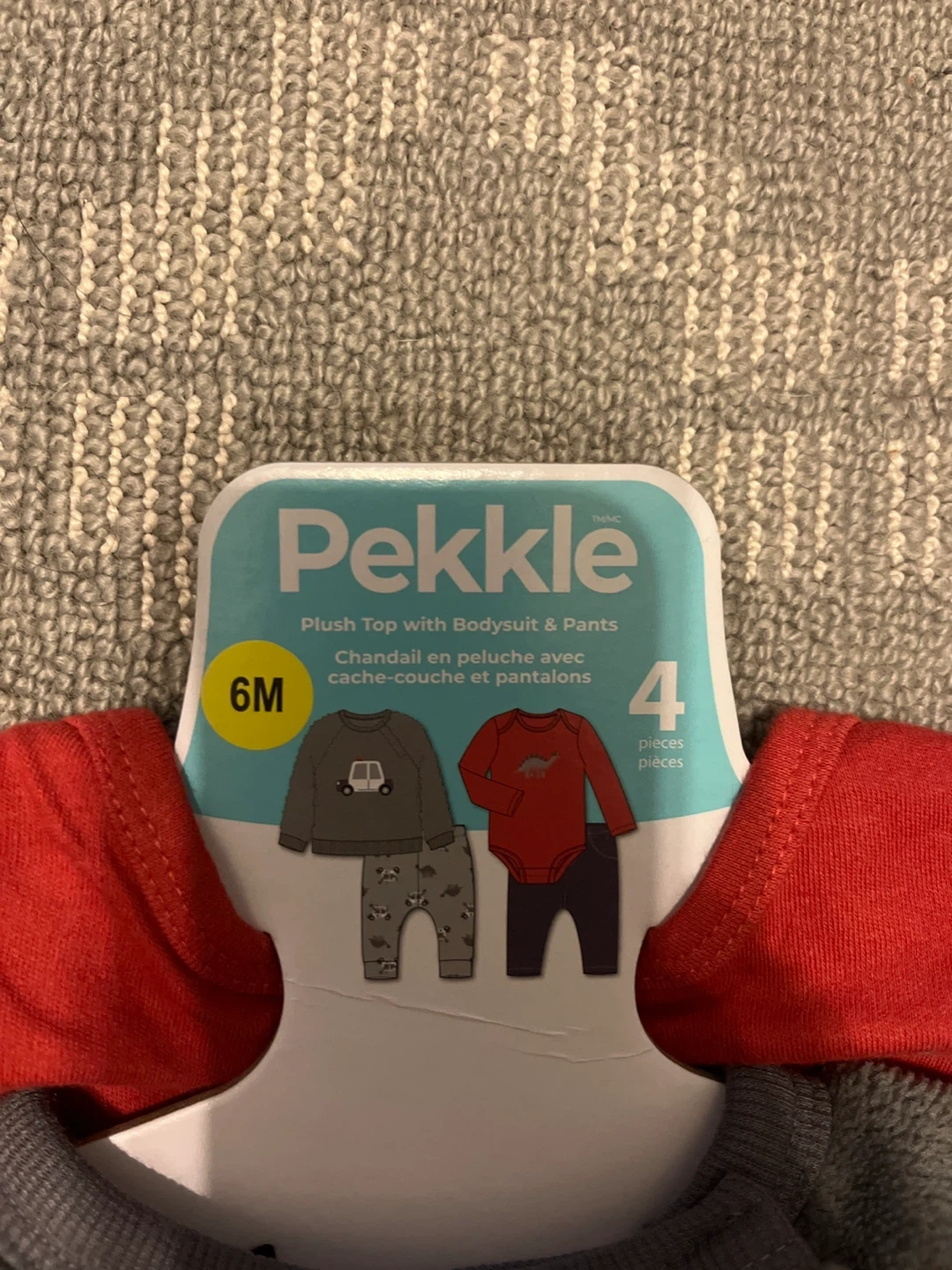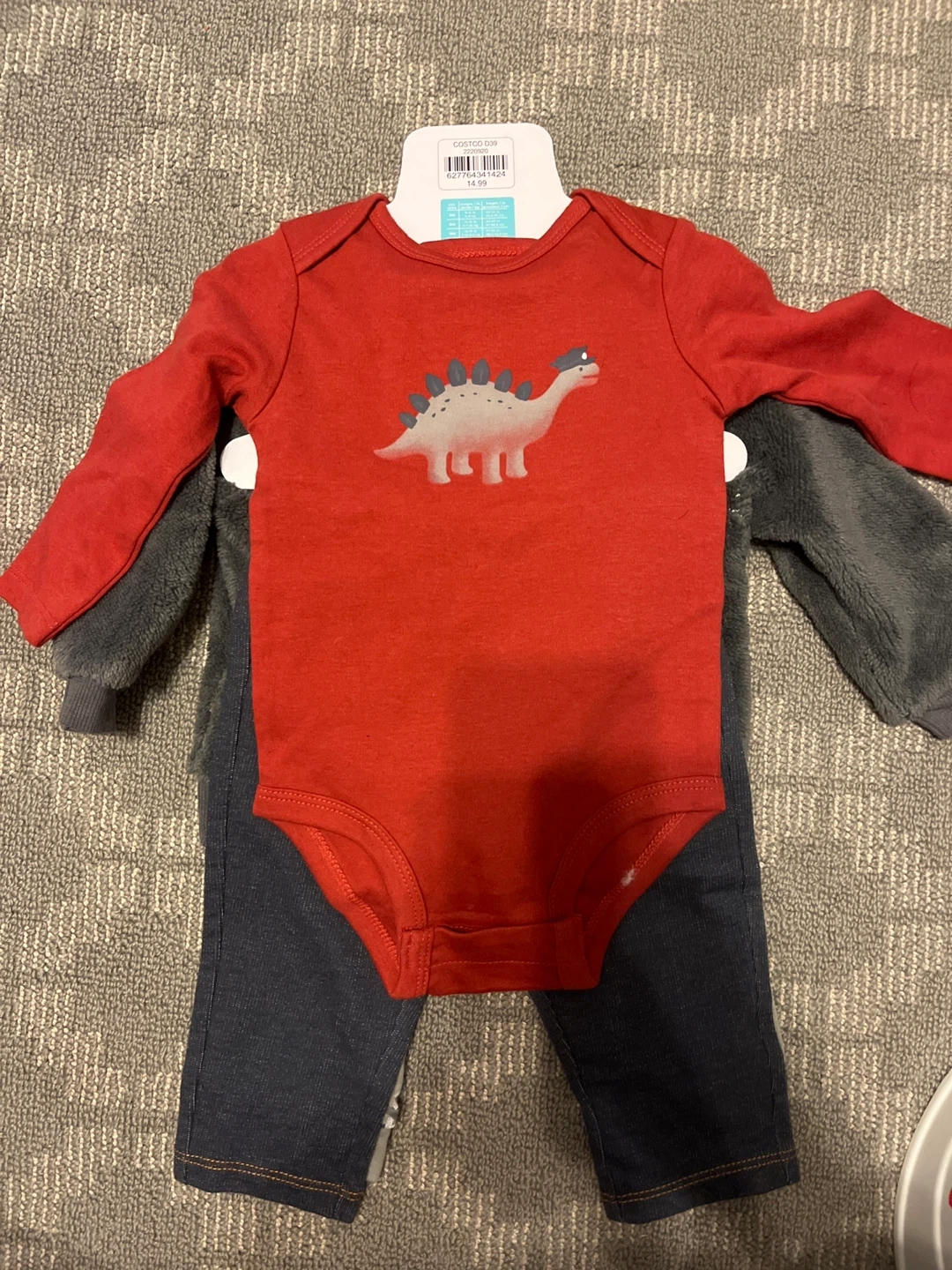 This Pekkle outfit includes a plush top, bodysuit, and pants for baby boys. It features adorable dinosaur and car prints. It's size 6 months.