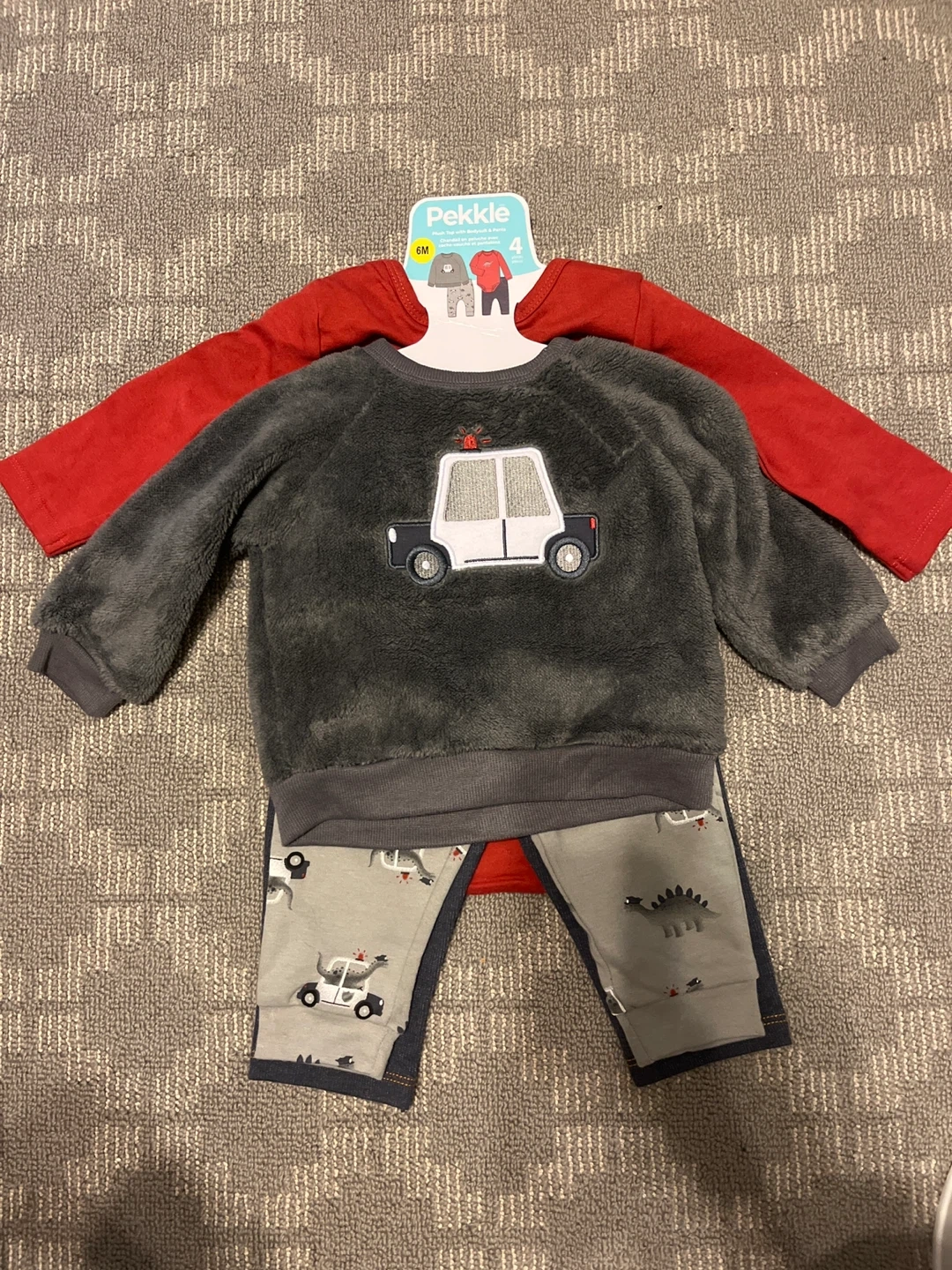 This Pekkle outfit includes a plush top, bodysuit, and pants for baby boys. It features adorable dinosaur and car prints. It's size 6 months.