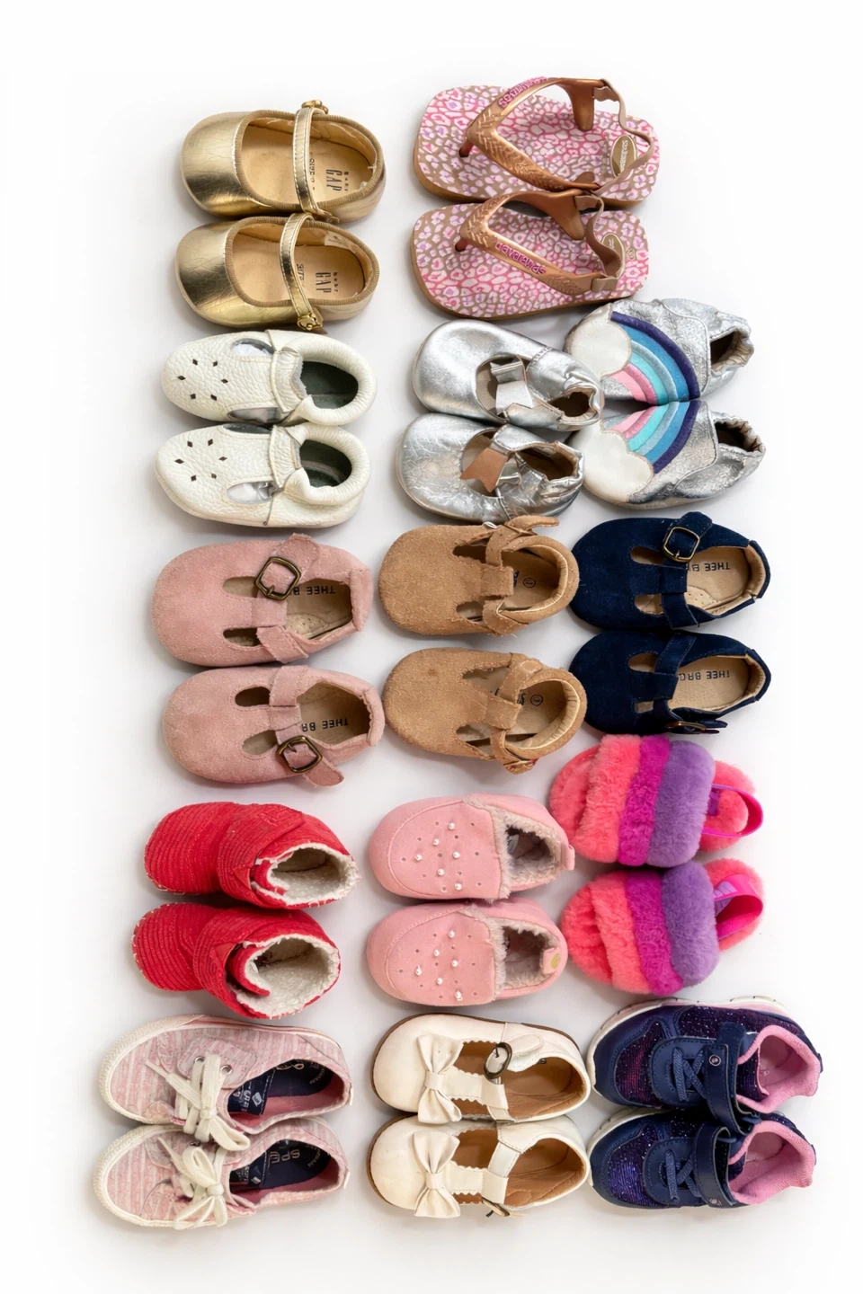 Assortment of baby shoes in different colors and styles, including flats, sandals, and sneakers. Some shoes feature decorative elements like bows or glitter. Materials vary, including leather, canvas, and fuzzy textures. Sizes are suitable for infants and toddlers.