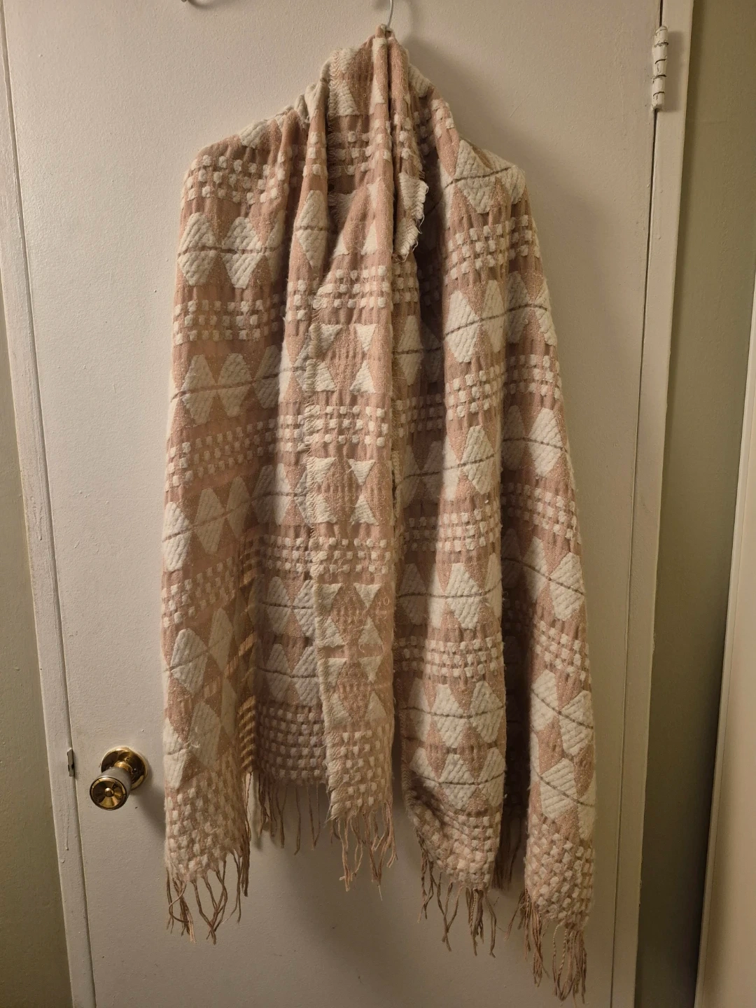 A cozy scarf featuring a geometric pattern in pink and white. It has a soft texture and fringed edges. Great for bundling up in the cold weather.
