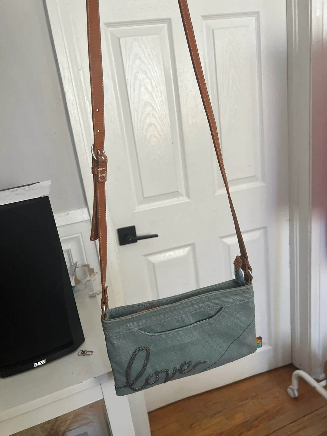 A bluish gray canvas crossbody bag with "love" embroidered on the front pocket. It features tan leather straps and trim. This bag is great for carrying essentials on the go!