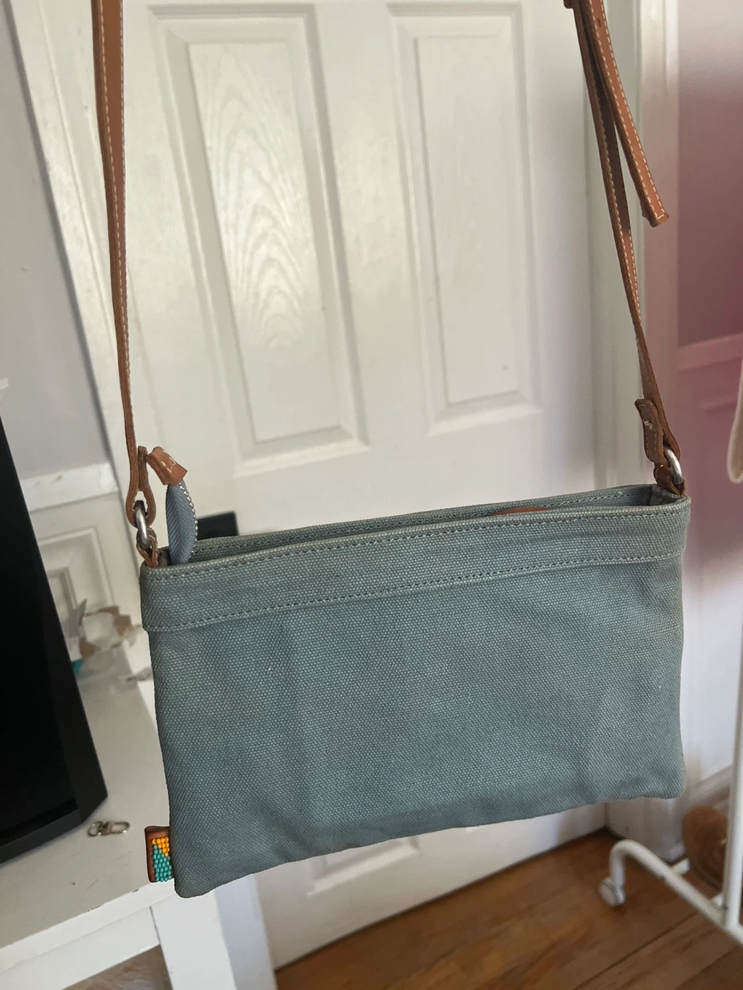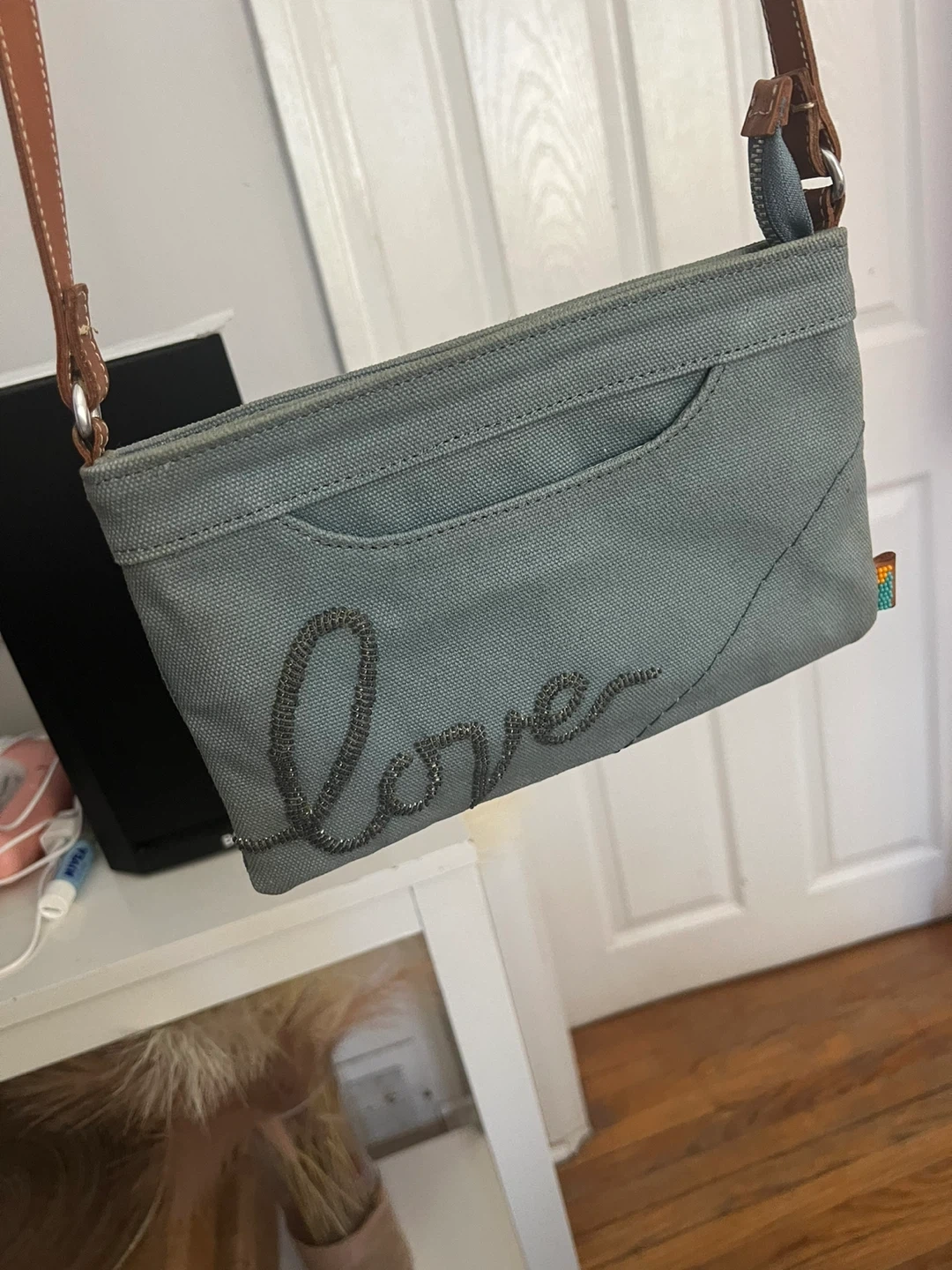 A bluish gray canvas crossbody bag with "love" embroidered on the front pocket. It features tan leather straps and trim. This bag is great for carrying essentials on the go!