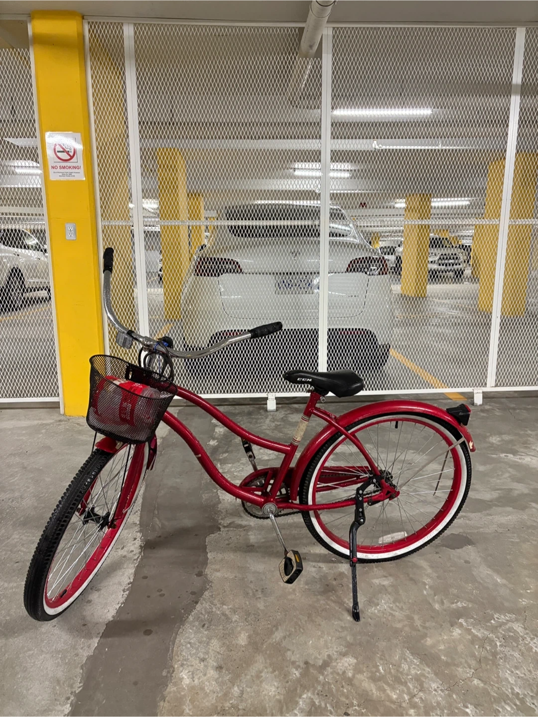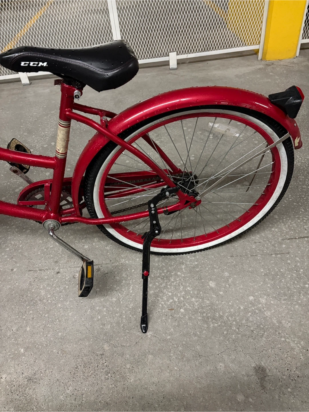 This red CCM cruiser bicycle is a classic style for comfortable rides. It features a front basket for convenience. It's perfect for leisurely trips around the neighbourhood.