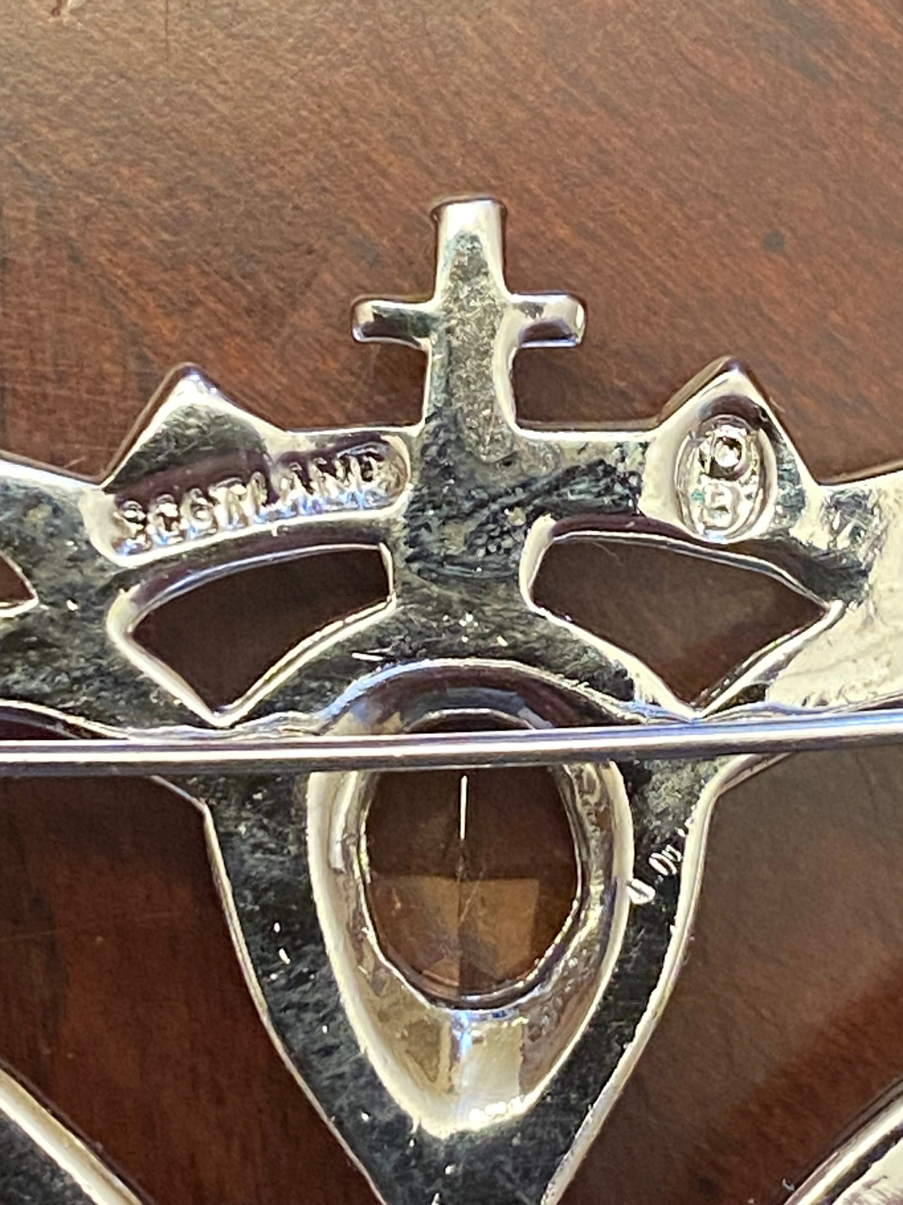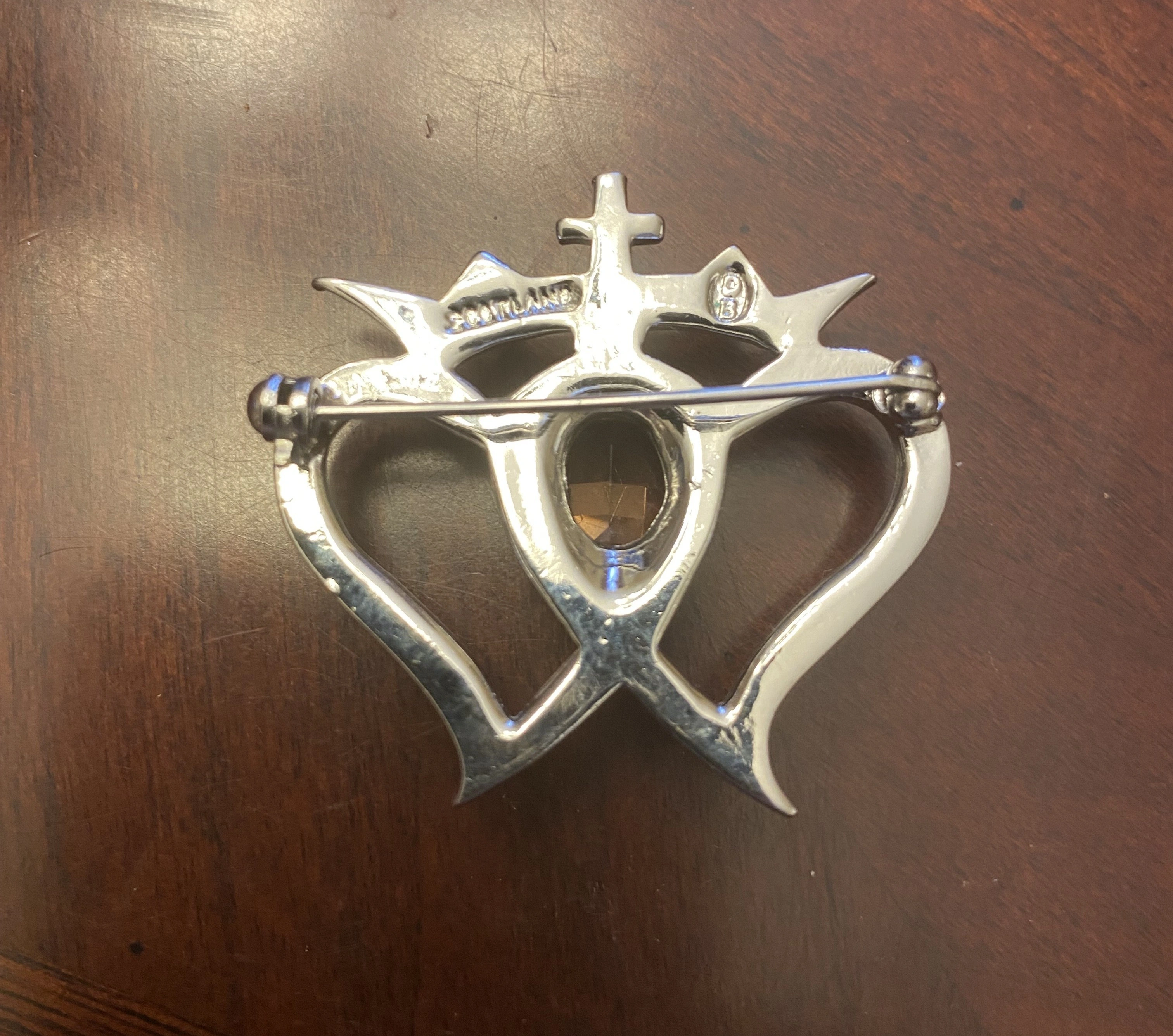 The brooch features a heart and crown design with a central amber-coloured stone.