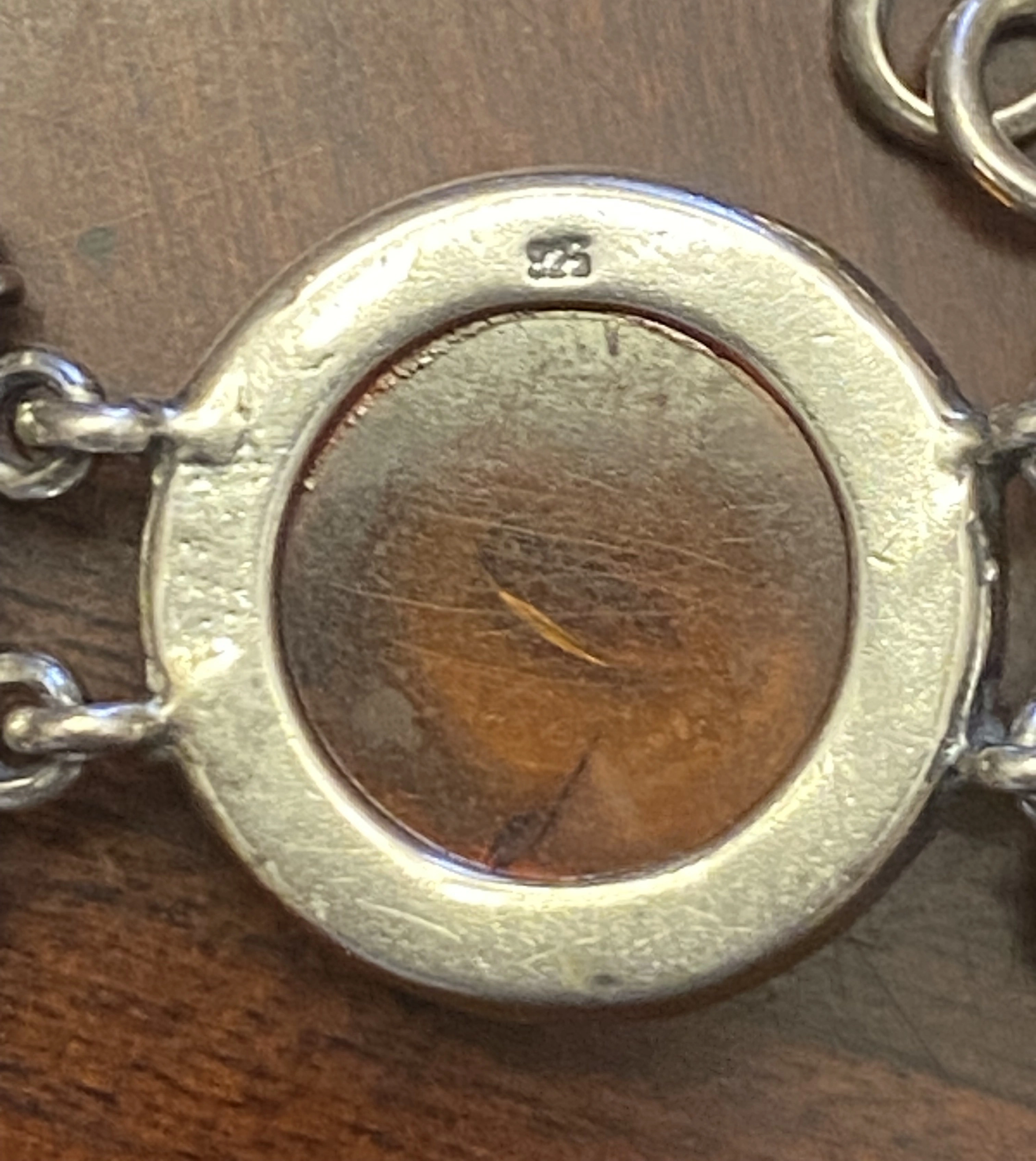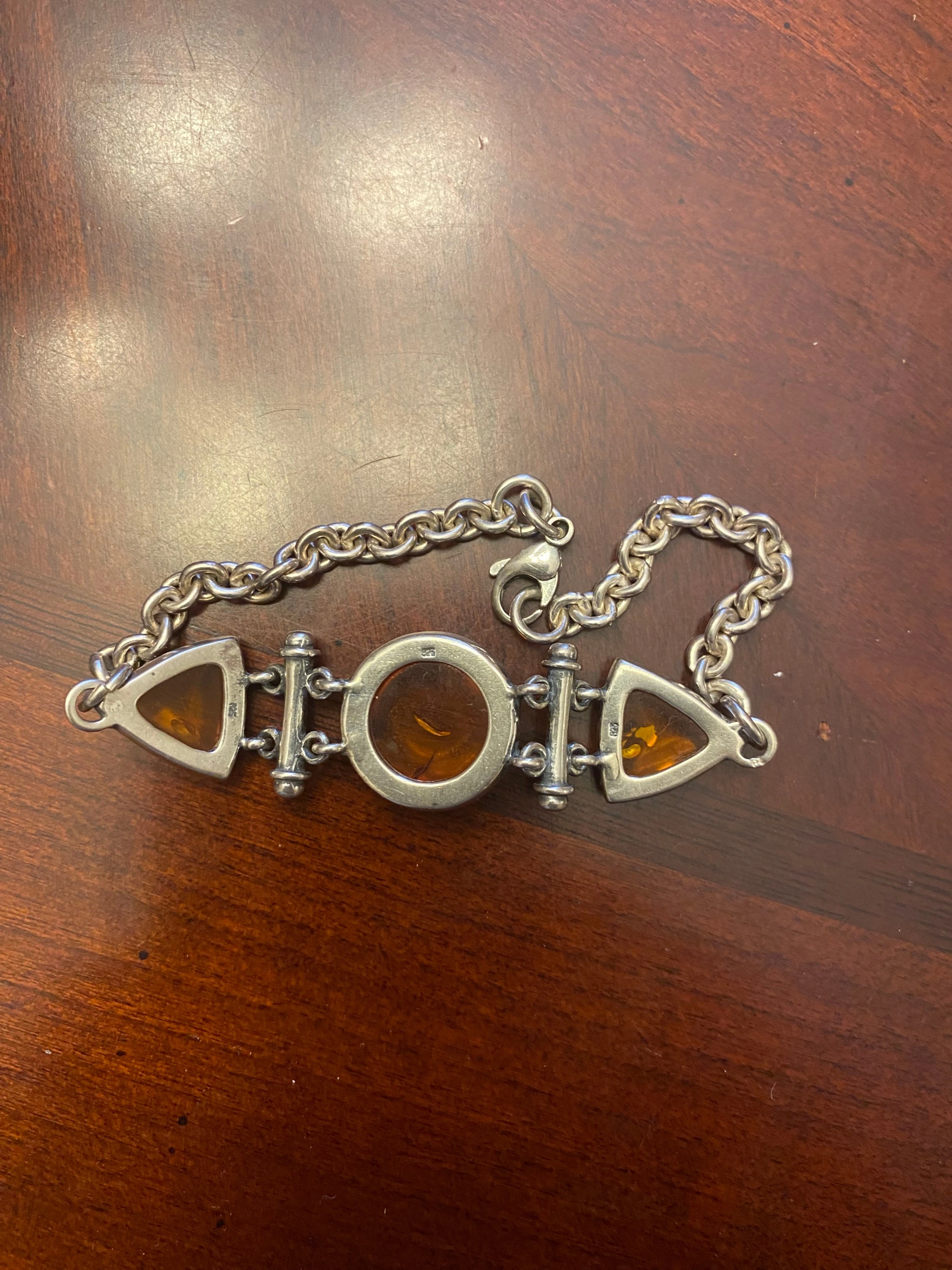 The bracelet has amber-coloured stones in triangular and round settings. Both pieces are in good condition and have a unique, vintage charm. The bracelet appears to be stamped 925
