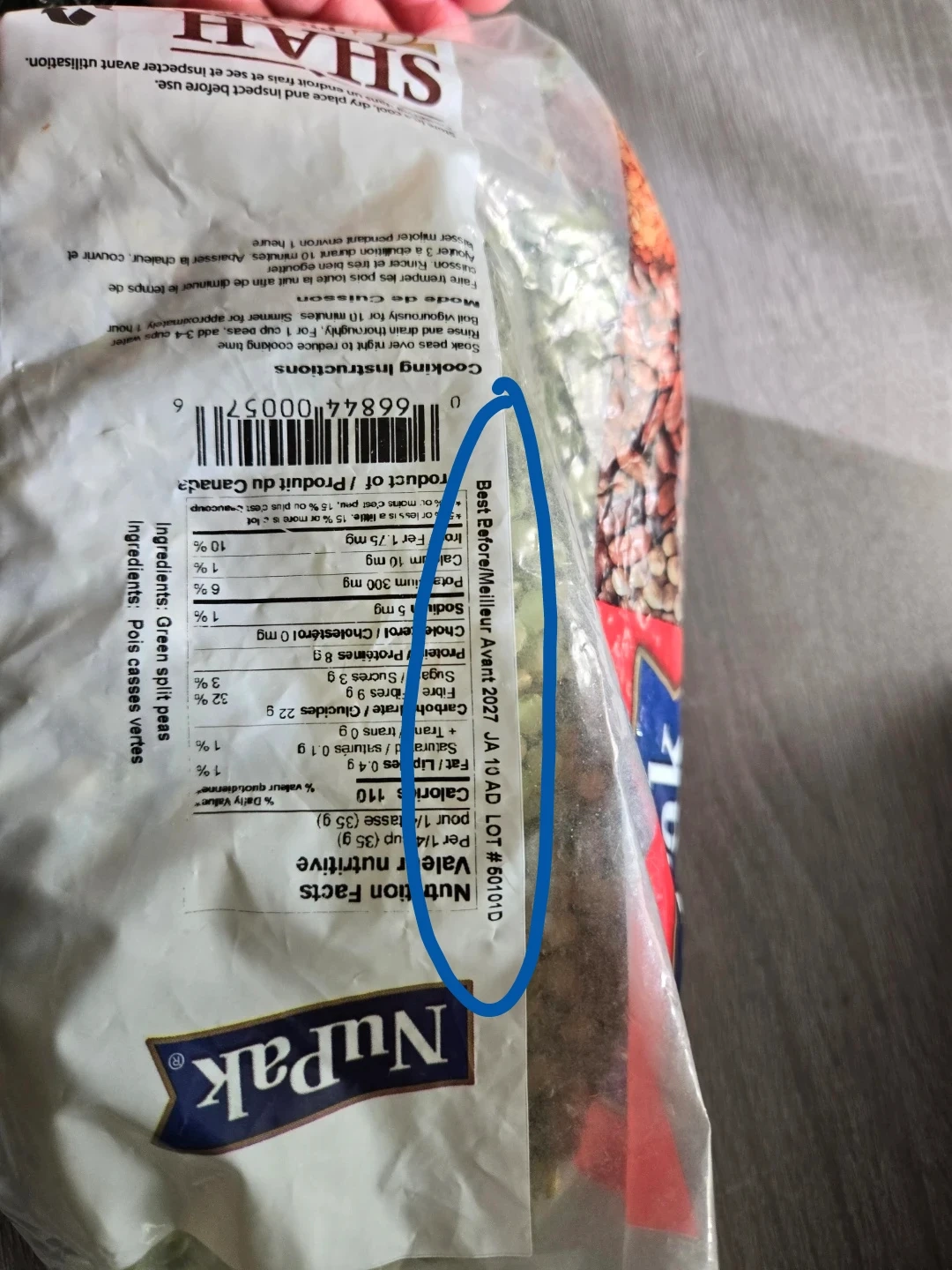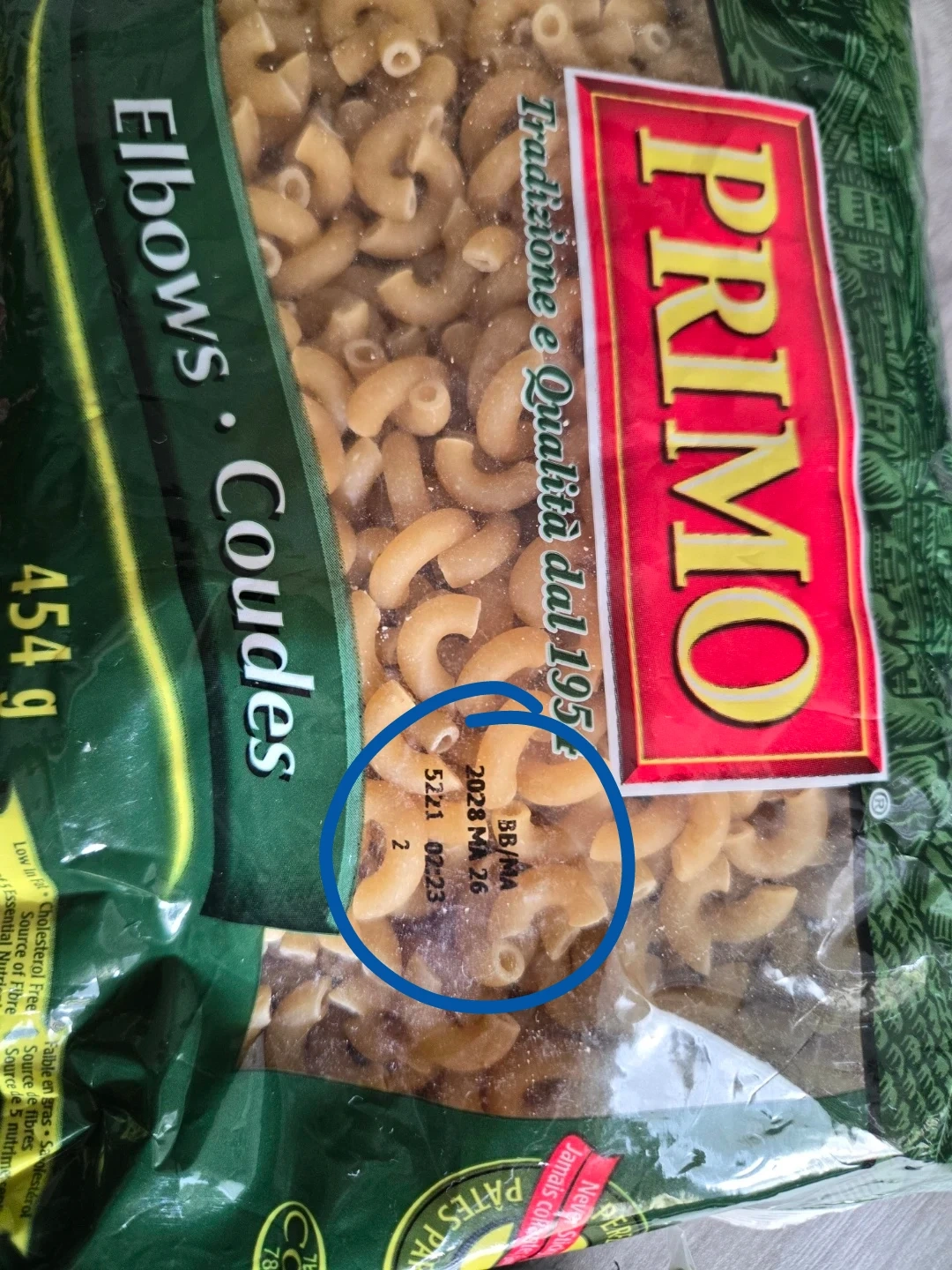 Two 454g bags of Primo Elbows pasta, expiring 2028 February. Also includes one 500g bag of NuPak Green Split Peas, best before 2027 August.