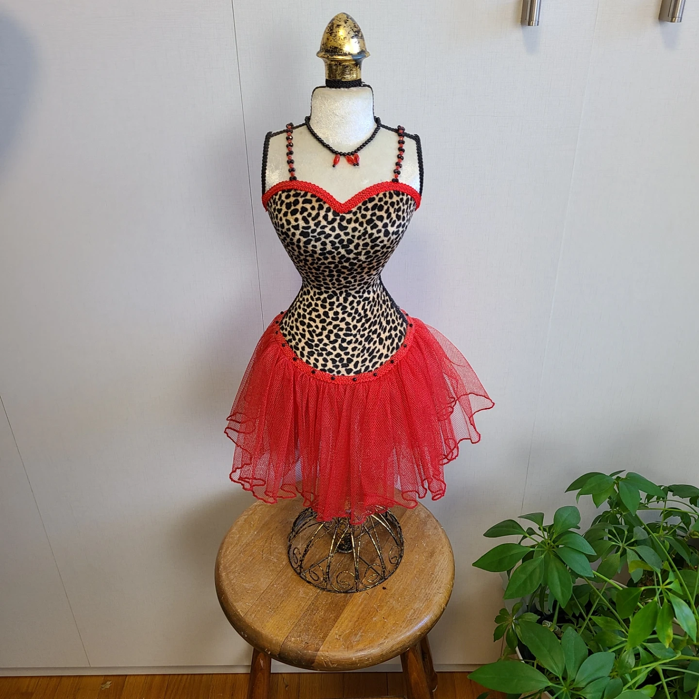 This decorative mannequin showcases a leopard print bodice with a sweetheart neckline and a vibrant red tulle skirt. It features a beaded necklace detail. It's a fun piece for displaying accessories or as a quirky decor item!