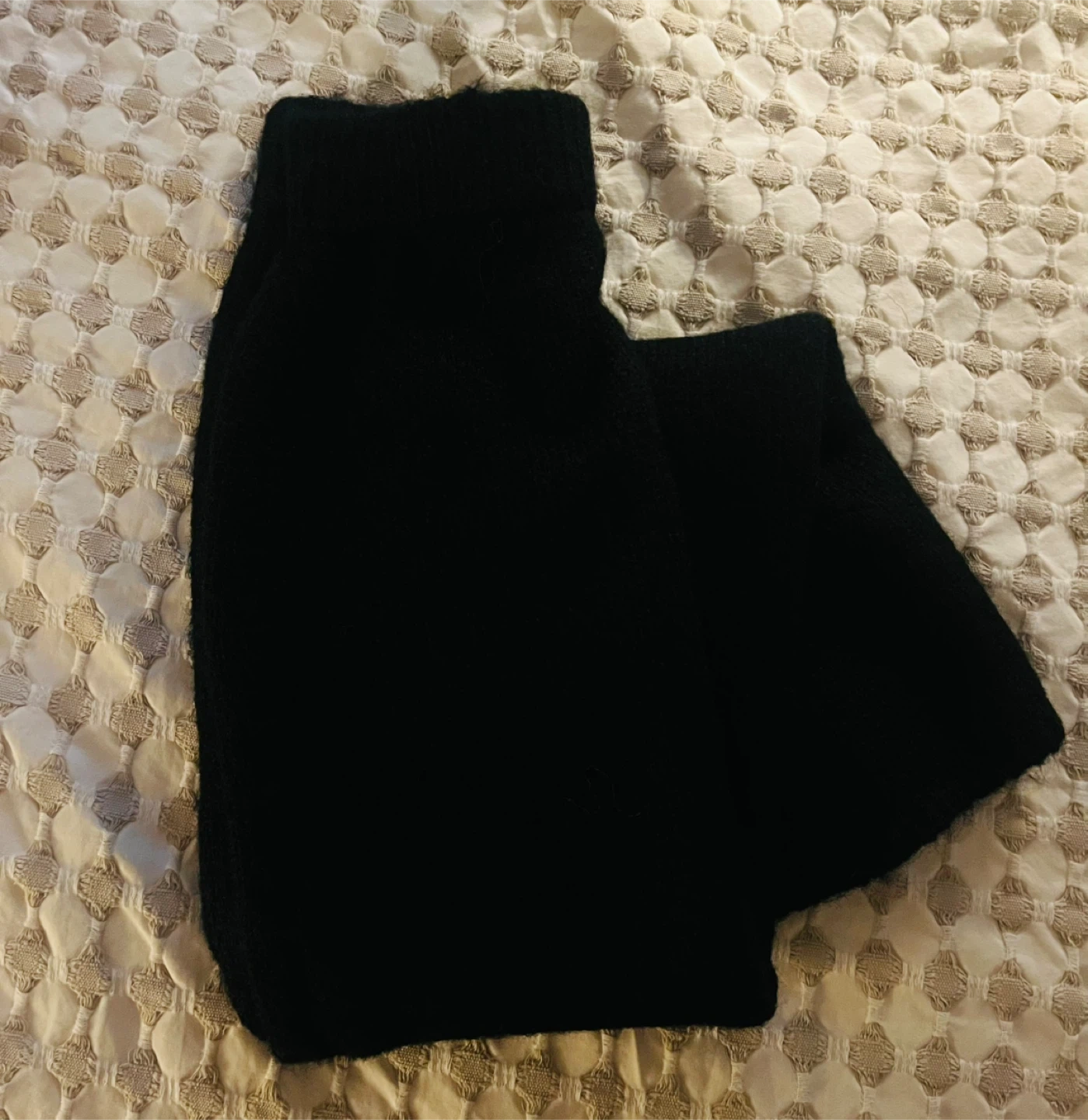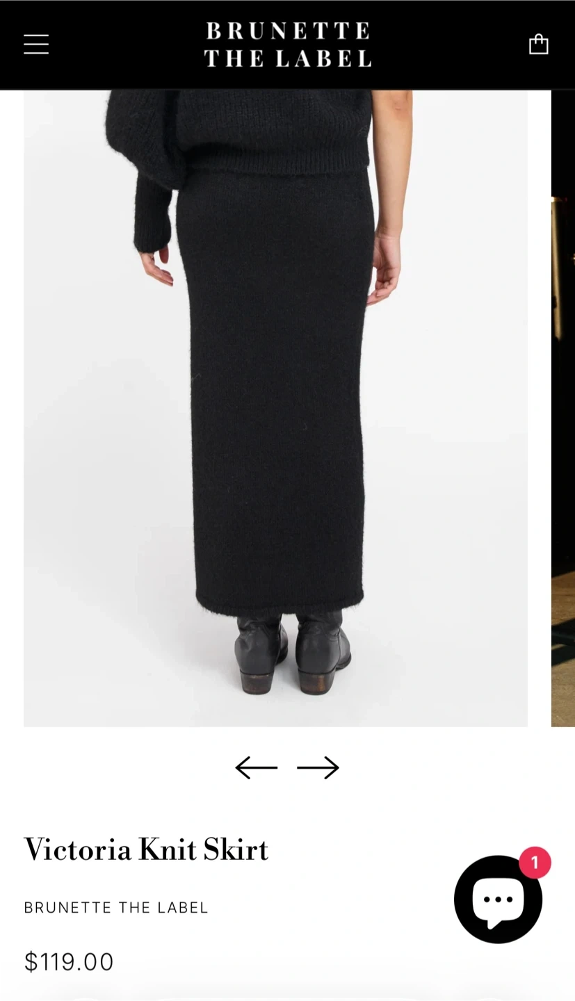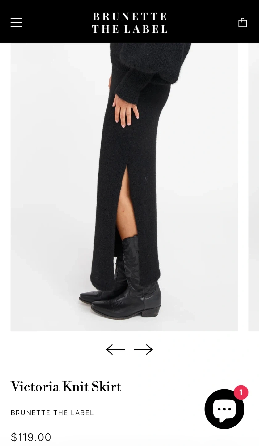 This is the Brunette The Label Victoria Knit Skirt. It's a maxi-length skirt with a thigh-high slit. Size is S/M but fits tight. Made from a soft knit material.