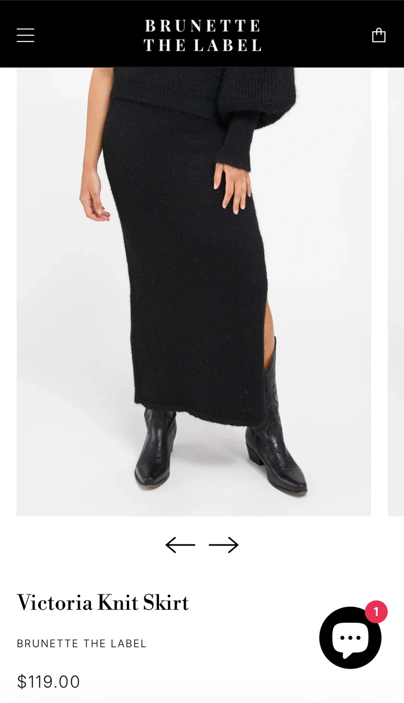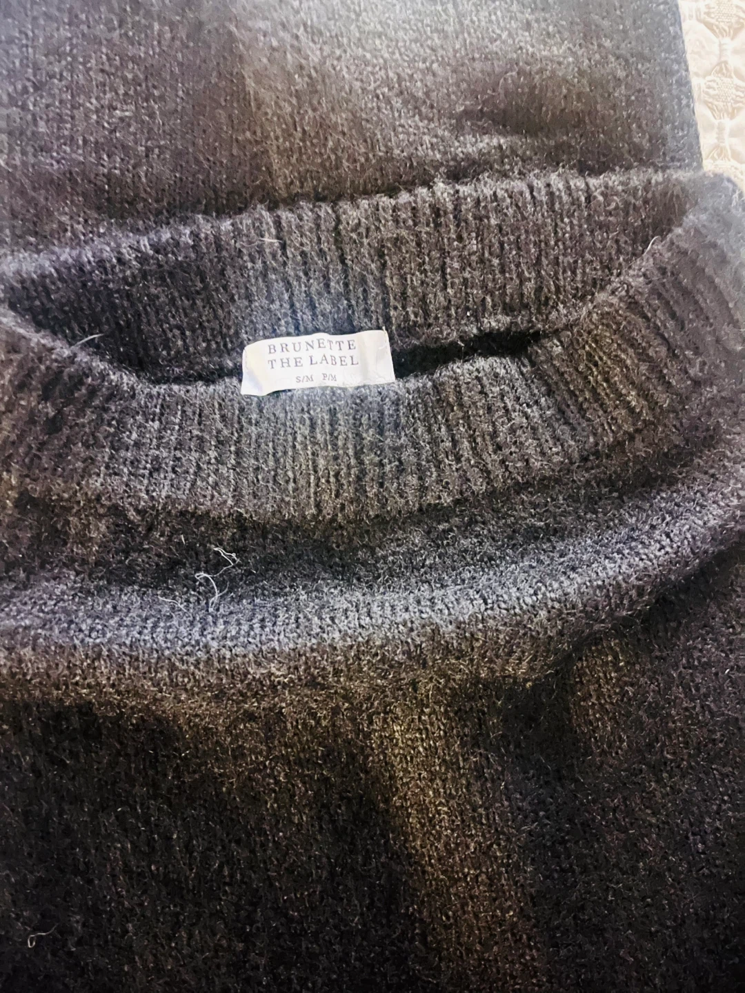 This is the Brunette The Label Victoria Knit Skirt. It's a maxi-length skirt with a thigh-high slit. Size is S/M but fits tight. Made from a soft knit material.