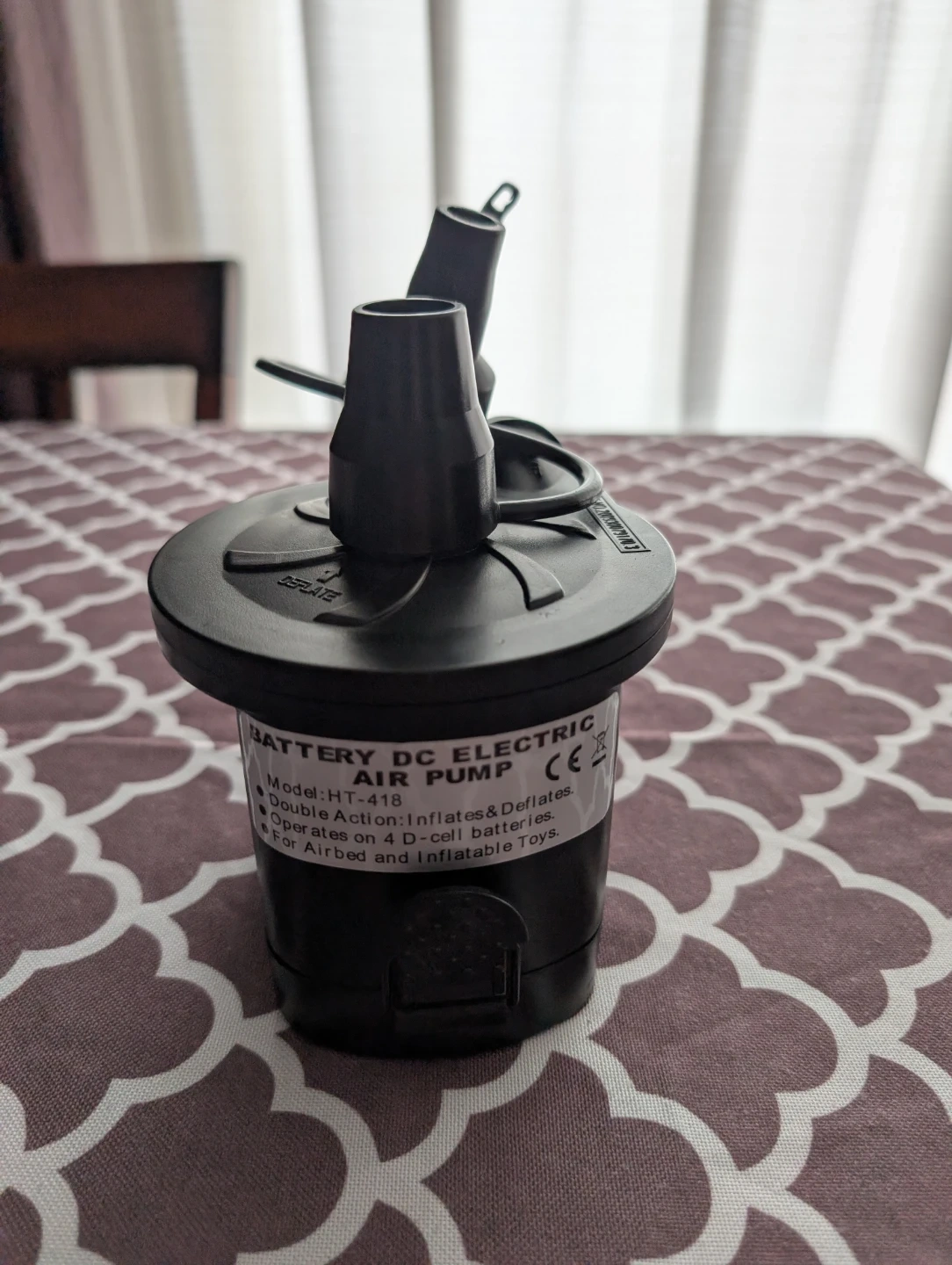 Battery-powered DC electric air pump. It's a double-action pump that inflates and deflates. It operates on D-cell batteries and is suitable for airbeds and inflatable toys.
