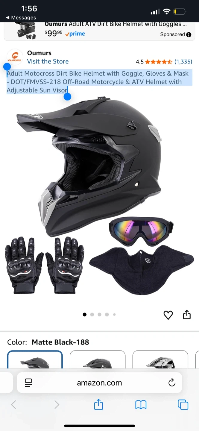 This is an adult motocross dirt bike helmet set. It includes goggles, gloves, and a mask. The helmet has a DOT/FMVSS-218 certification and an adjustable sun visor. It's matte black.