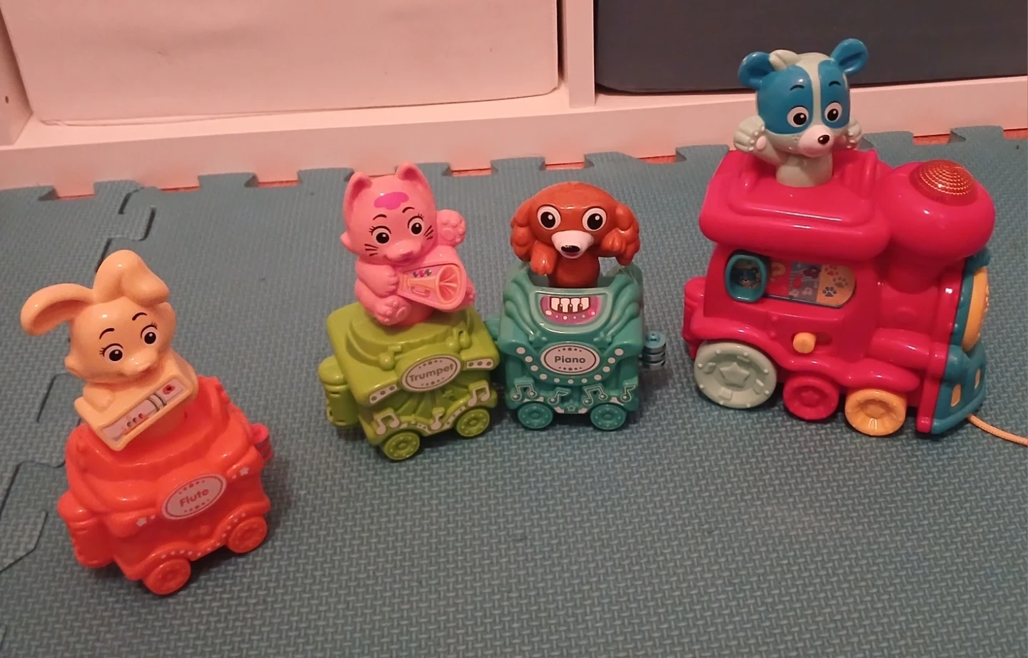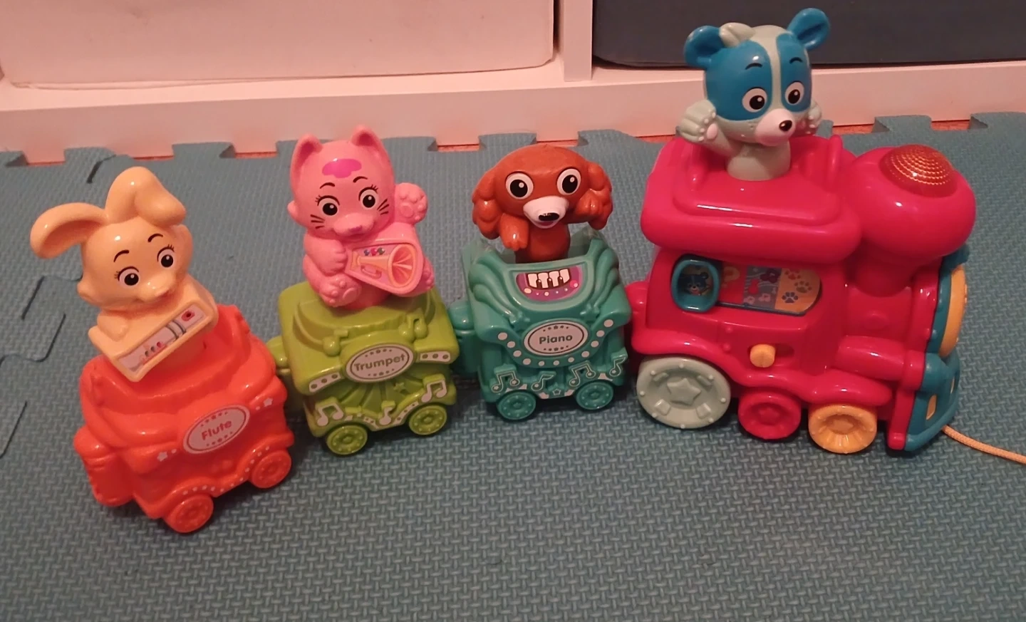 This is a fun musical train toy set featuring four different animal cars. Each car is designed to look like a different instrument: flute, trumpet, and piano. The train has a blue bear on top and lights up. It's a great toy for little ones to play with and explore sounds.