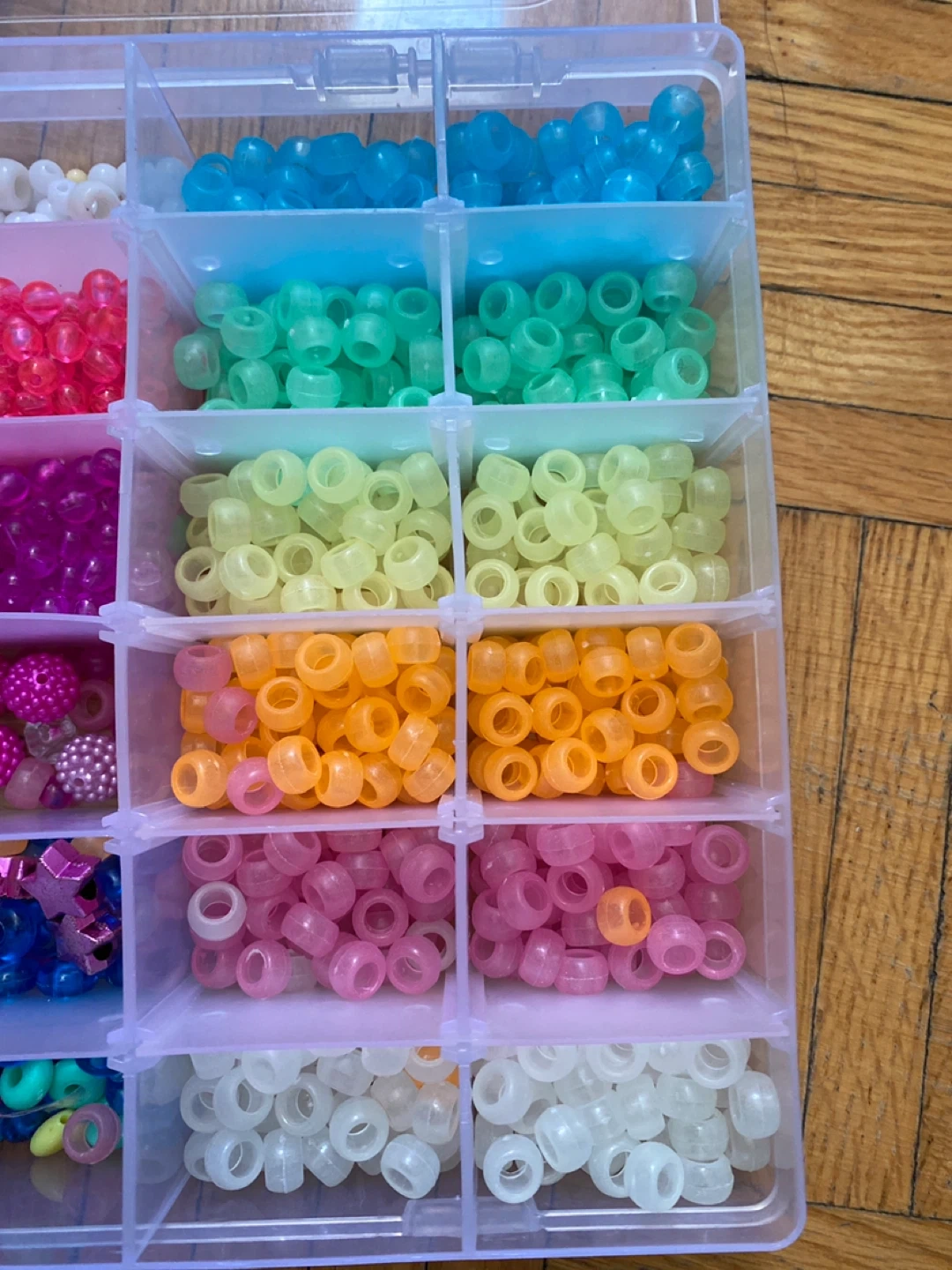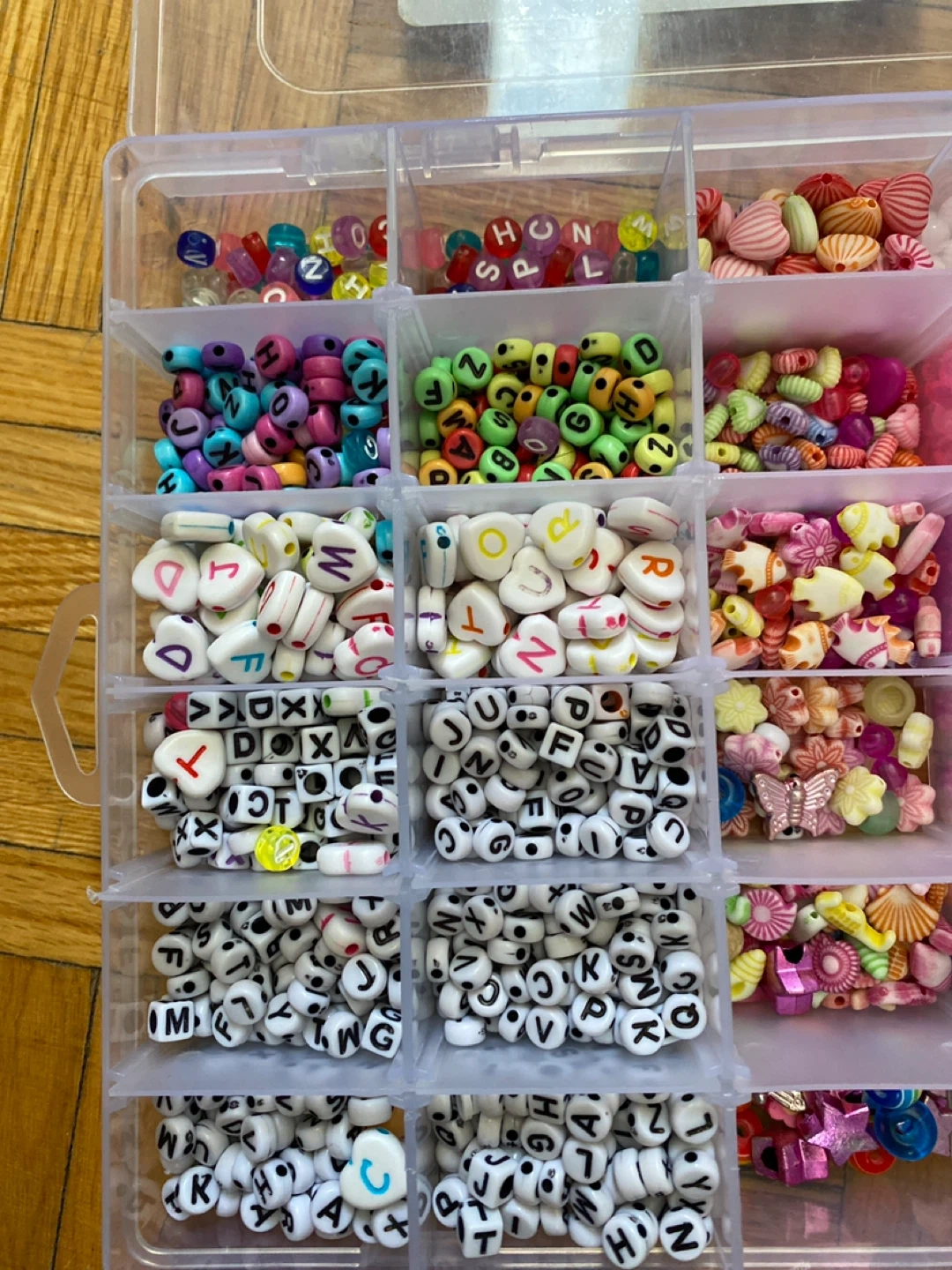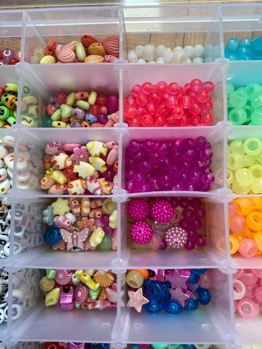 This crafting kit includes a wide variety of beads in different shapes, colours, and sizes. It features alphabet beads for personalized creations and fun themed charms like butterflies and seashells. Great for making bracelets, necklaces, and other DIY jewellery projects!