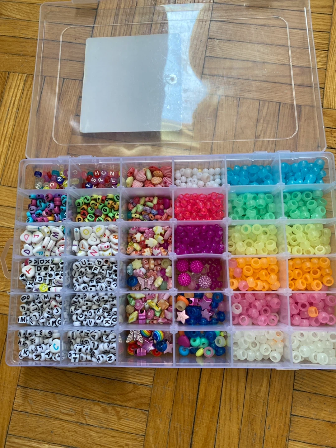 This crafting kit includes a wide variety of beads in different shapes, colours, and sizes. It features alphabet beads for personalized creations and fun themed charms like butterflies and seashells. Great for making bracelets, necklaces, and other DIY jewellery projects!